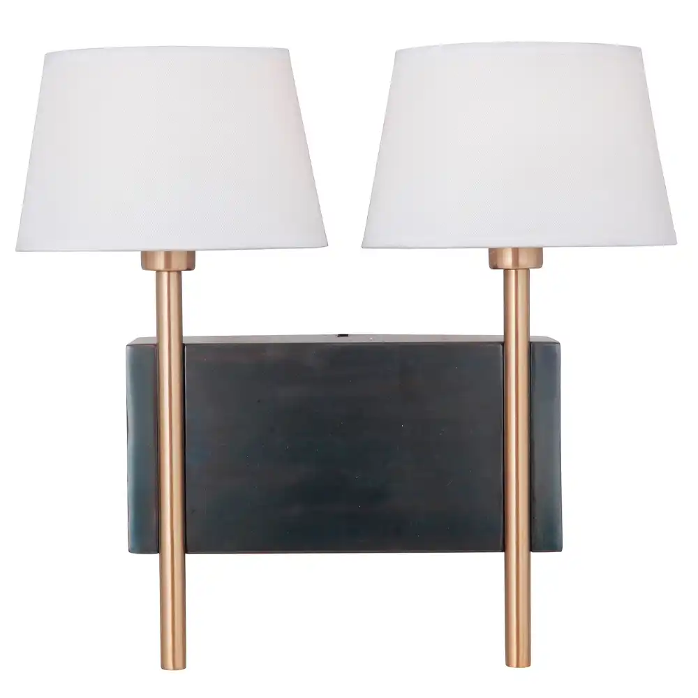 Finish: The rectangular backplate features a unique, hand-applied Verdigris Patina or Dark Aged Bronze finish, exhibiting subtle variations and hints of deep blues and greens (customizable to solid matte black, bronze, etc.). The vertical arms and shade trim are finished in a contrasting, lustrous Brushed Brass or Polished Gold finish, adding a touch of warmth and elegance. The fabric shades are a versatile Crisp White or Off-White tone, ensuring soft, diffused light (shade material and color customizable).