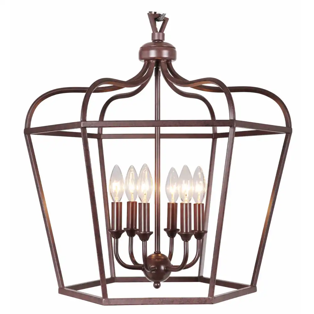 Introduce a captivating blend of rustic charm and contemporary design with the “Farmhouse Lantern” 6-Light Open Chandelier, a versatile fixture ideal for modern farmhouse, industrial, or transitional interiors. The robust metal framework of this chandelier is meticulously finished in a hand-applied aged bronze or antique copper. This finish is characterized by its deep, rich brown base with subtle coppery or reddish undertones, and a slightly textured or brushed surface that evokes a sense of time-worn elegance and artisanal craftsmanship.