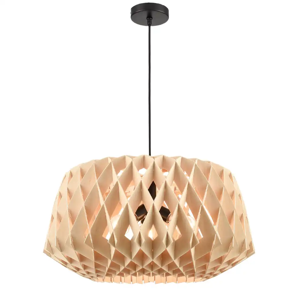 Matte Black Contrast: The internal metal structure and canopy are finished in matte black, which is a crucial design detail. It grounds the light wood, preventing it from looking too rustic or “craftsy.” It gives the fixture a modern spine.