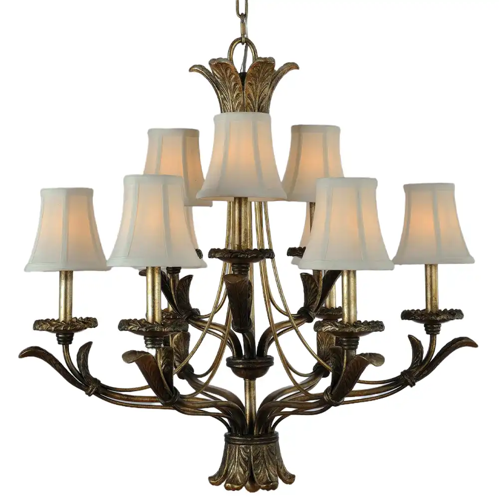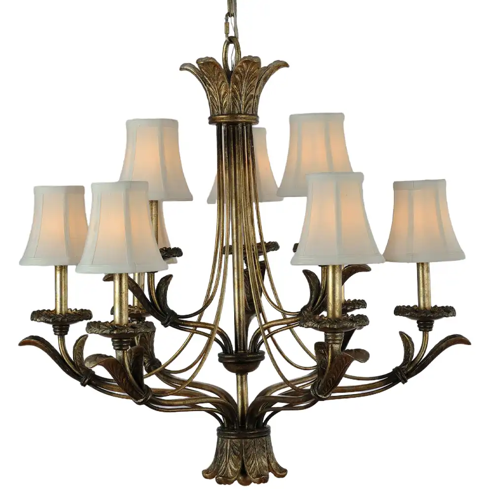 Discover the “Gilded Renaissance” 2-tier, 9-light chandelier, a masterpiece with an antiqued gold leaf finish, intricate botanical details, and elegant fabric bell shades. Handcrafted and fully customizable for OEM/ODM/B2B wholesale projects.