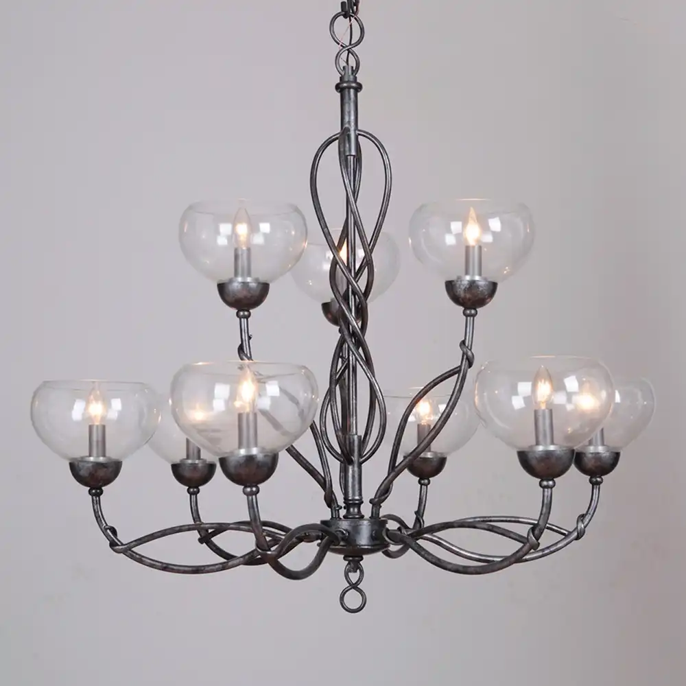 Meticulously handcrafted from high-strength metal, the Grand Forged Elegance boasts a profoundly stable and enduring structure, ensuring both majestic aesthetic appeal and reliable long-term performance. Its impressive silhouette features a central column formed by beautifully twisted metal, flowing down to two distinct tiers. The upper tier gracefully holds three clear glass globe shades, while a larger lower tier expands to encompass six additional matching globe shades. These transparent globes encase the light sources, allowing for bright, unhindered illumination that casts a widespread glow throughout your space while showcasing the intricate scrollwork of the frame. The thoughtful construction and exquisite detailing reflect a profound understanding of creating luxurious and inviting decorative lighting for expansive environments.