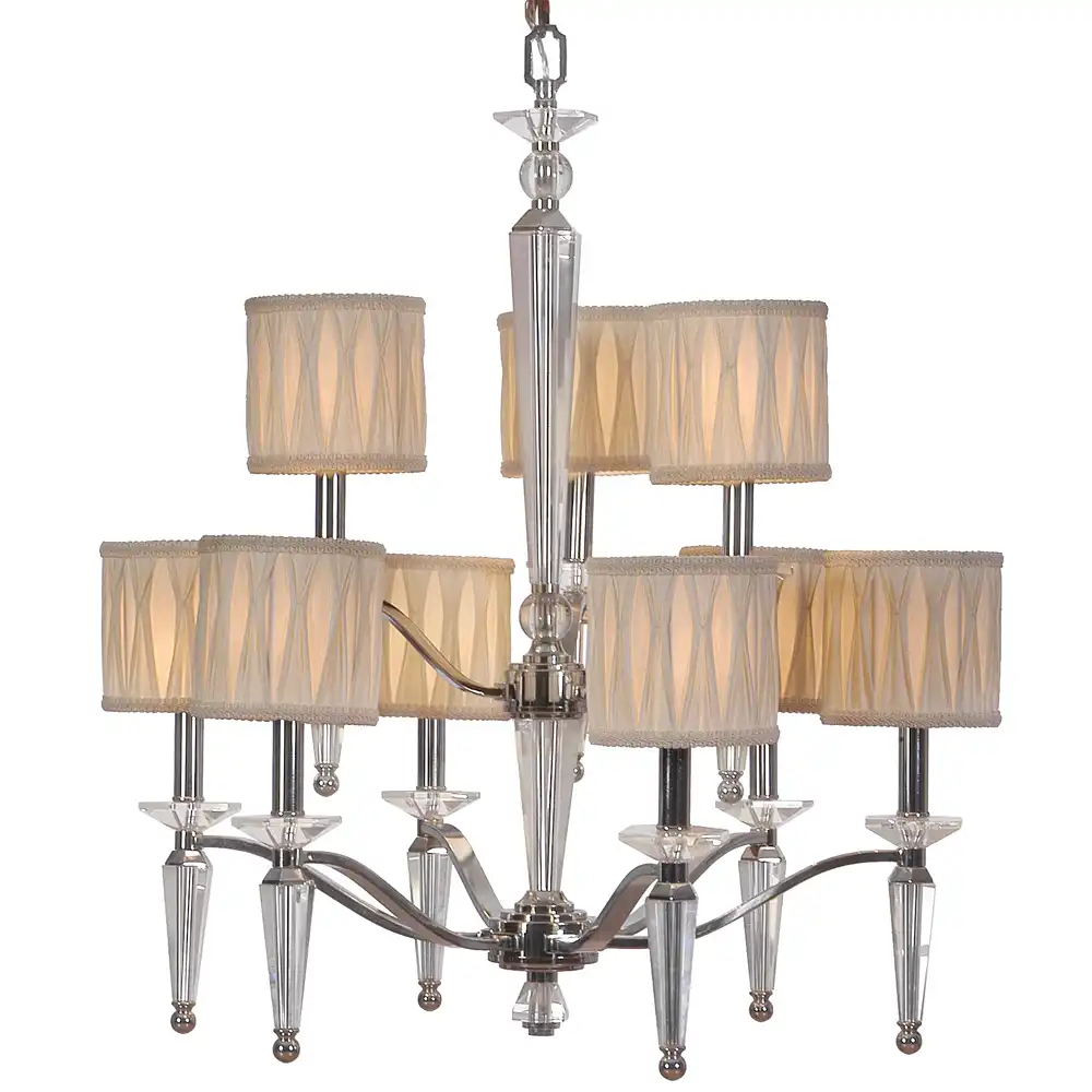 Introduce an air of refined opulence with the “Grandeur” 2-Tier 9-Light Bespoke Chandelier, a magnificent fixture designed to impart a sophisticated glow in substantial spaces. Masterfully handcrafted from high-strength metal, this chandelier exhibits a lustrous polished chrome finish, known for its mirror-like sheen and ability to enhance both classic and contemporary aesthetics. Its impressive two-tier structure, featuring three light holders on the upper tier and six on the lower, is adorned with striking clear crystal accents and elegant pleated fabric shades in a delicate creamy off-white hue. These shades provide a beautifully diffused light, creating an inviting and luxurious atmosphere.