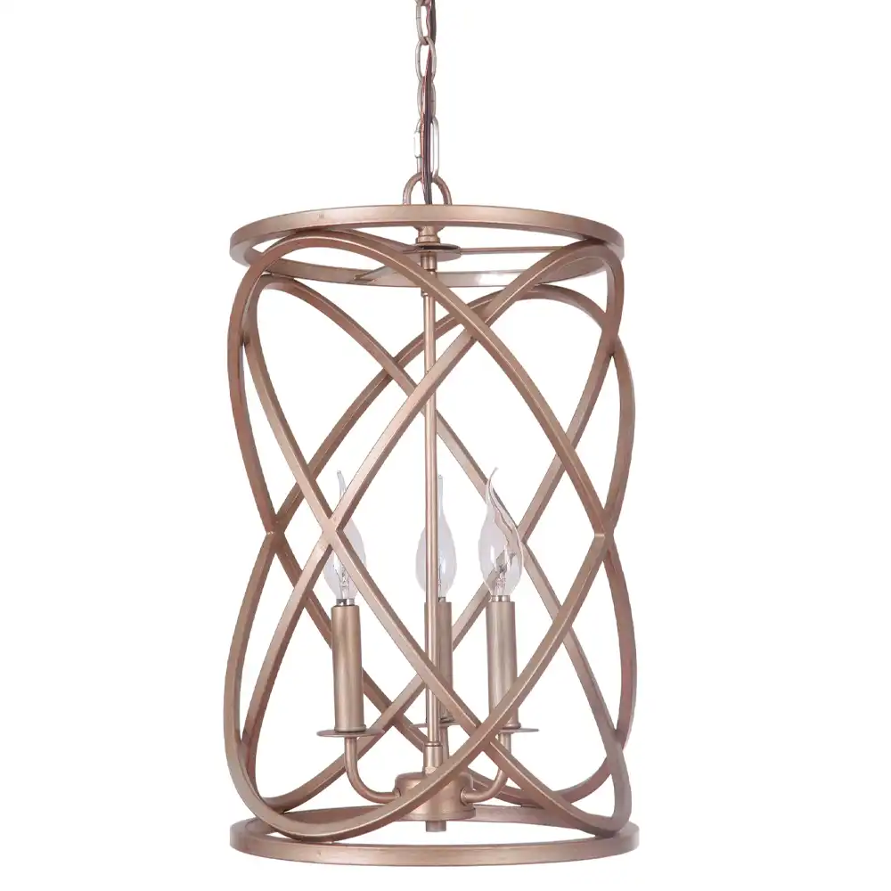 Transitional gold 3-light cylindrical pendant with an intricate intertwined metal cage design. High-strength metal construction, customizable for B2B/wholesale orders. Perfect for modern farmhouse and contemporary spaces.