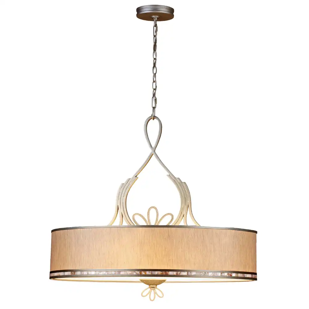 The pendant’s striking design centers around a broad, shallow drum-shaped shade enveloped in a delicate, finely woven beige fabric. This fabric expertly diffuses the internal four lights to create a soft, expansive ambient glow that minimizes harshness. The drum shade is beautifully bordered by a band of iridescent shell or mother-of-pearl tiles, adding a subtle play of natural color and sheen that shimmers as light reflects. Above the drum, an ornate metalwork structure features elegant, flowing, stylized ’embrace’ or ‘infinity loop’ motifs, adorned with delicate beaded detailing, crafted from a complementary lighter, warmer-toned metal, possibly a light gold or champagne finish, adding intricate visual interest and a touch of bespoke artistry. A similar decorative element gracefully accents the underside of the fixture. Constructed from high-strength metal, the fixture’s stable structure guarantees exceptional durability and long-term visual appeal, making it an ideal choice for discerning residential and upscale commercial spaces. Dedicated to customized production and OEM/ODM/B2B partnerships, we offer extensive flexibility to modify parameters such as the shape and pattern of welded stems, wire color, materials, and dimensions, ensuring a perfect alignment with your clients’ unique project specifications. This wide drum pendant is an exemplary choice for projects demanding bespoke, artisan-quality lighting that reflects a profound understanding of interior decoration and exquisite craftsmanship.
