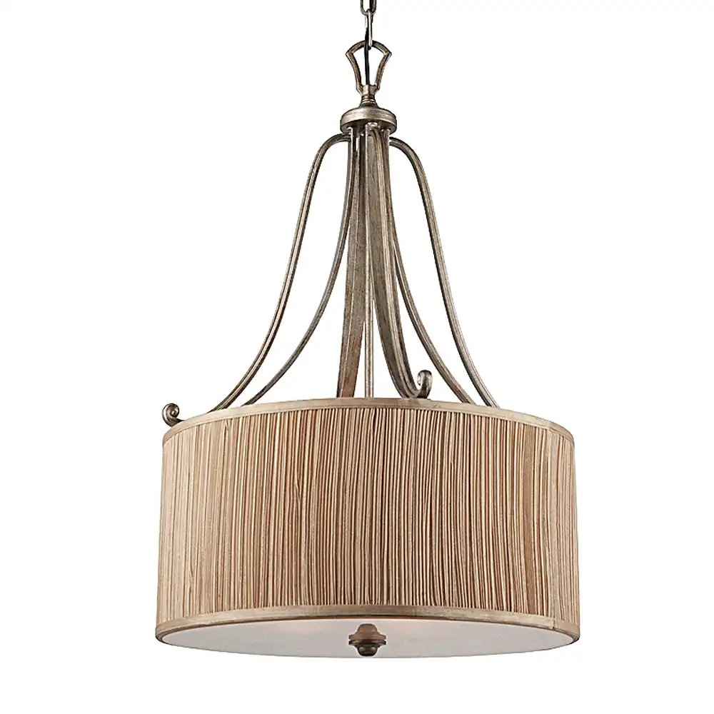 The pendant’s elegant frame features gracefully curved metal arms extending from a central stem, creating a harmonious and flowing silhouette. This captivating framework is rendered in a sophisticated distressed antique champagne or aged silver finish. This muted, warm silvery-gold or pale bronze tone, with subtle darker distressing, provides an authentic, artisanal, and slightly weathered look that exudes understated charm. Encasing the three internal lights is a classic pleated natural linen or champagne-toned fabric drum shade. The fine vertical pleating adds textural interest and a bespoke touch, while diffusing light softly and evenly to create an inviting, ambient glow that fosters comfort and sophistication.