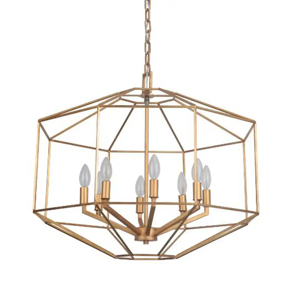 Handcrafted 8-light hexagonal open-cage chandelier with a luxurious brushed antique brass finish. Made from high-strength metal. Fully customizable for OEM/ODM/B2B projects.