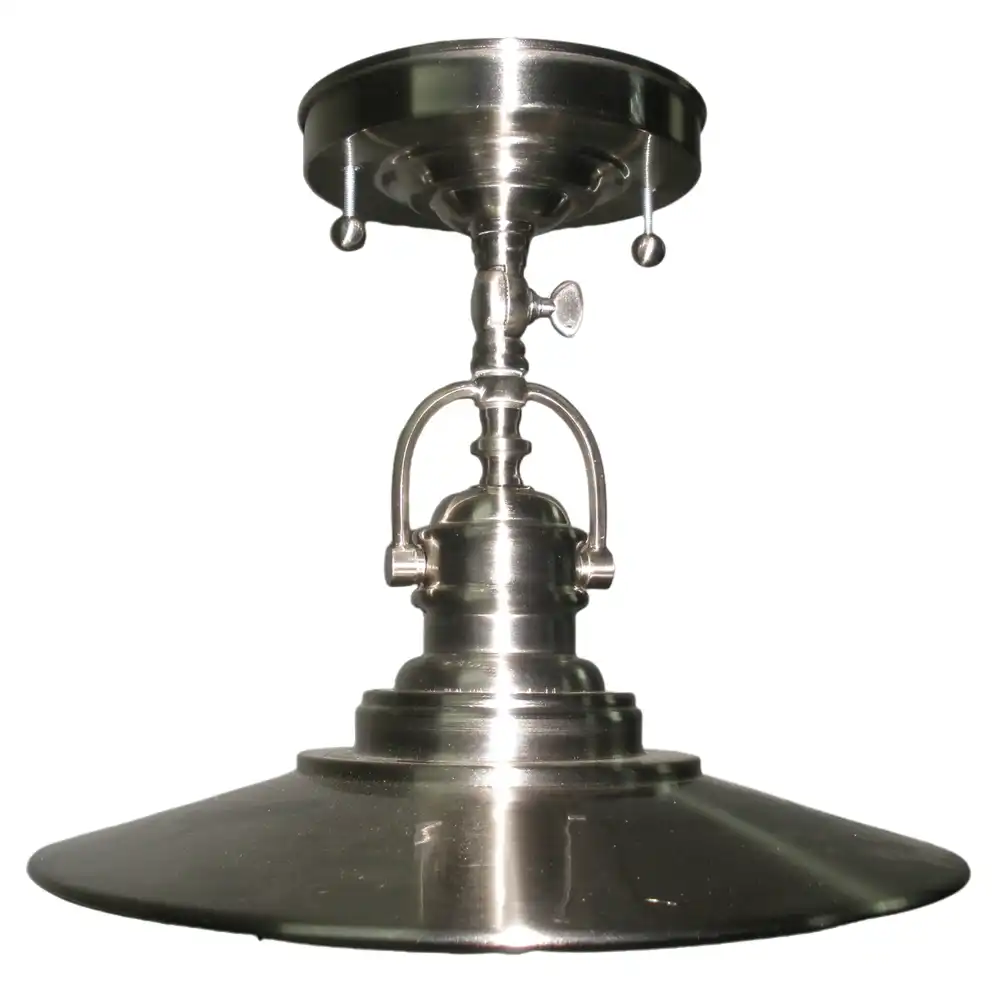 The fixture features a classic bell-shaped or wide-brimmed metal shade, directing light downwards for focused illumination. The design incorporates distinctive industrial elements such as exposed hardware, a functional-looking swivel or adjustable joint, and a sturdy canopy, all contributing to its authentic workshop-inspired charm. This semi-flush mounting style is ideal for spaces where a pendant is desired but ceiling height is a consideration, providing ample illumination without overwhelming the room.