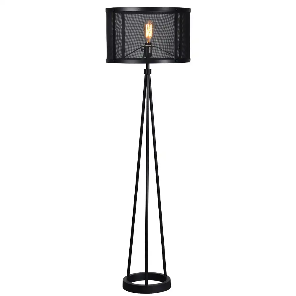 This distinctive floor lamp boasts a bold and stable tripod base, crafted from durable high-strength metal with a sleek matte black finish. The three slender legs converge to support a central stem, culminating in a striking cylindrical shade. The shade itself is a masterpiece of industrial chic, constructed from the same matte black finished metal in an open mesh design. This unique mesh allows a captivating glimpse of the exposed Edison-style bulb (not included, but recommended for aesthetic completion), creating a warm, inviting glow with intriguing light patterns.