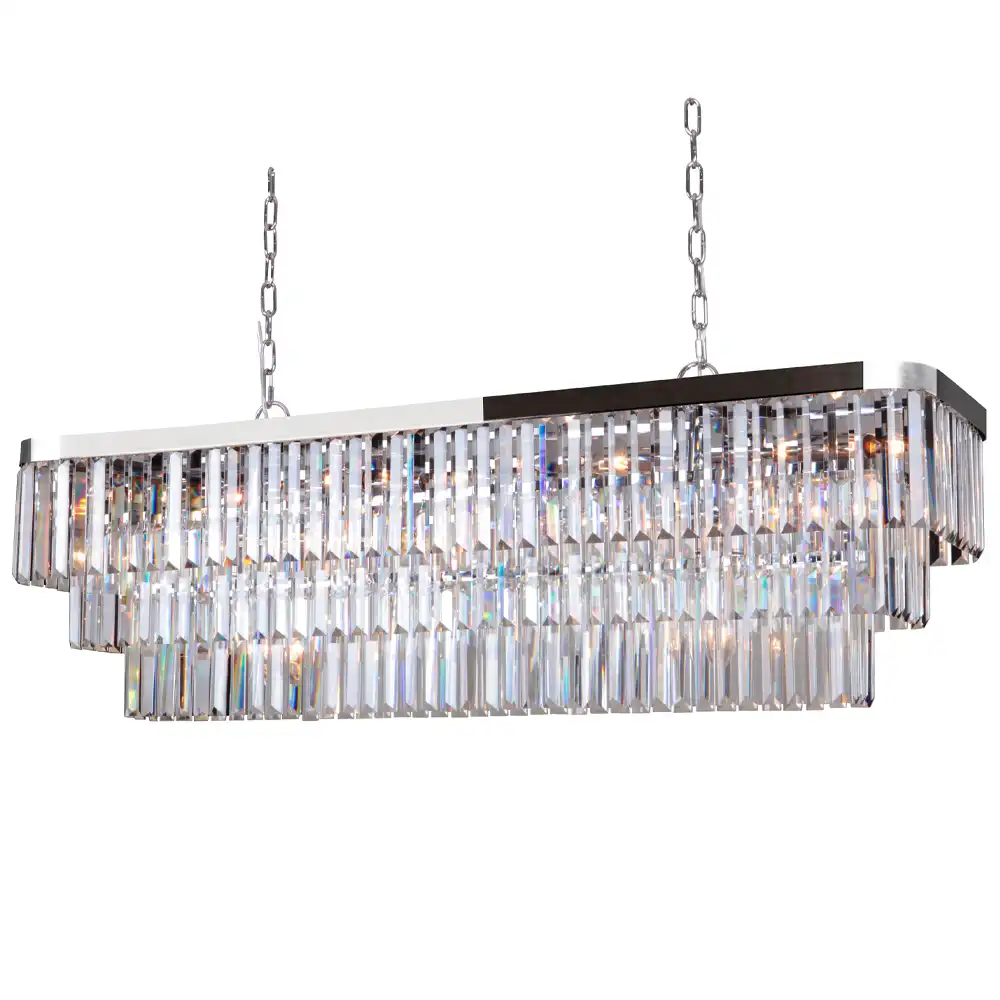 • Striking Rectangular Design: A modern linear form with three cascading tiers of crystal prisms, ideal for island or dining table placement.