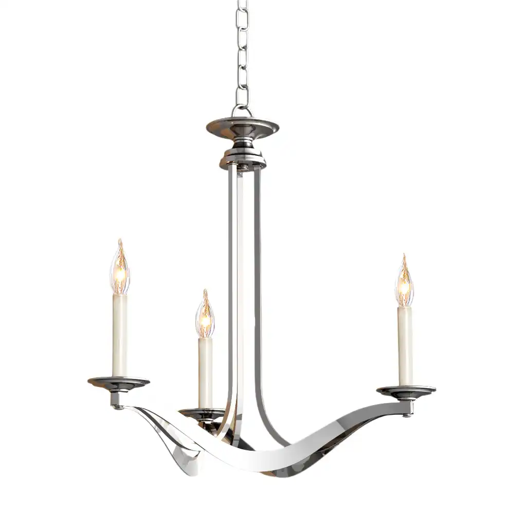 Three gracefully curved arms extend outwards, forming fluid, ribbon-like arcs that define the chandelier’s unique modern aesthetic. Each arm culminates in a classic candle-style light holder, complete with an elegant candle sleeve, evoking a sense of traditional charm balanced with contemporary flair. The exposed bulbs, reminiscent of candelabras, offer bright, ambient illumination that is both functional and visually appealing, enhancing the overall brilliance of the polished metal.