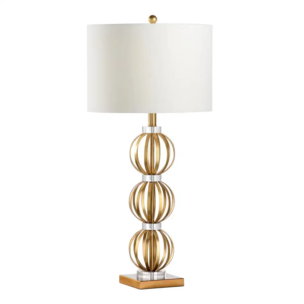 The Luminaire Orb features a captivating base composed of three exquisitely handcrafted, open-work orb sculptures, meticulously fashioned from high-strength metal. Each orb boasts a radiant polished gold finish, offering a warm and inviting glow that beautifully contrasts with the sleek, polished nickel bands that segment the design. This robust metal construction ensures a stable structure and exceptional durability, guaranteeing compatibility with long-term use.