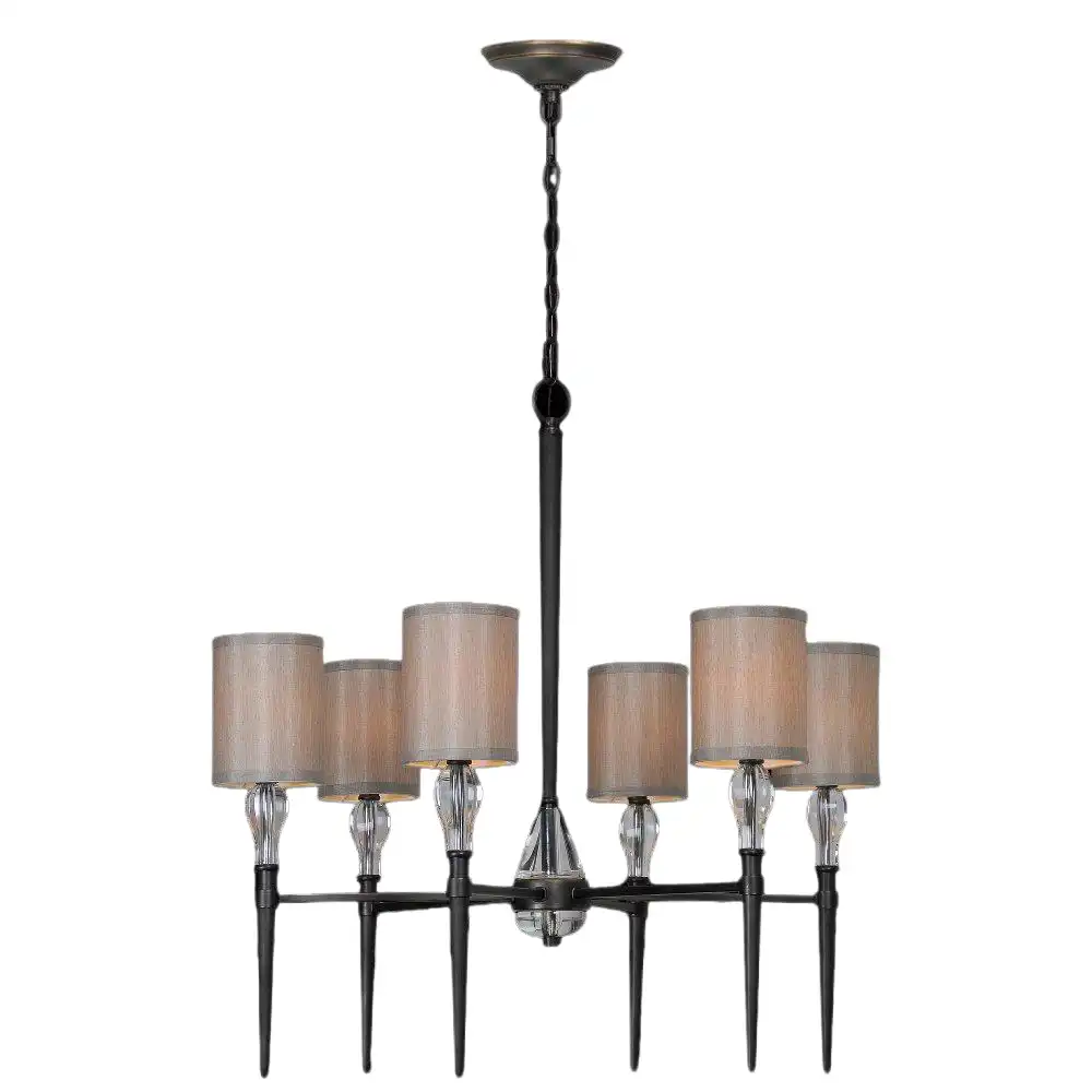 Meticulously handcrafted from high-strength metal, the Manhattan Grandeur boasts a stable and enduring structure, ensuring both timeless beauty and reliable long-term performance. Its striking design features a central tapered stem that descends to a horizontal frame, from which six arms extend. Each arm elegantly supports a clear faceted crystal accent, crowned by a tailored fabric drum shade in a neutral, earthy tone. The interplay between the dark, rich metal, the sparkling crystal, and the soft fabric shades creates a captivating visual texture and a warm, diffused illumination that transforms any space into an inviting sanctuary. The thoughtful detailing and precise construction reflect a profound understanding of luxurious decorative lighting.