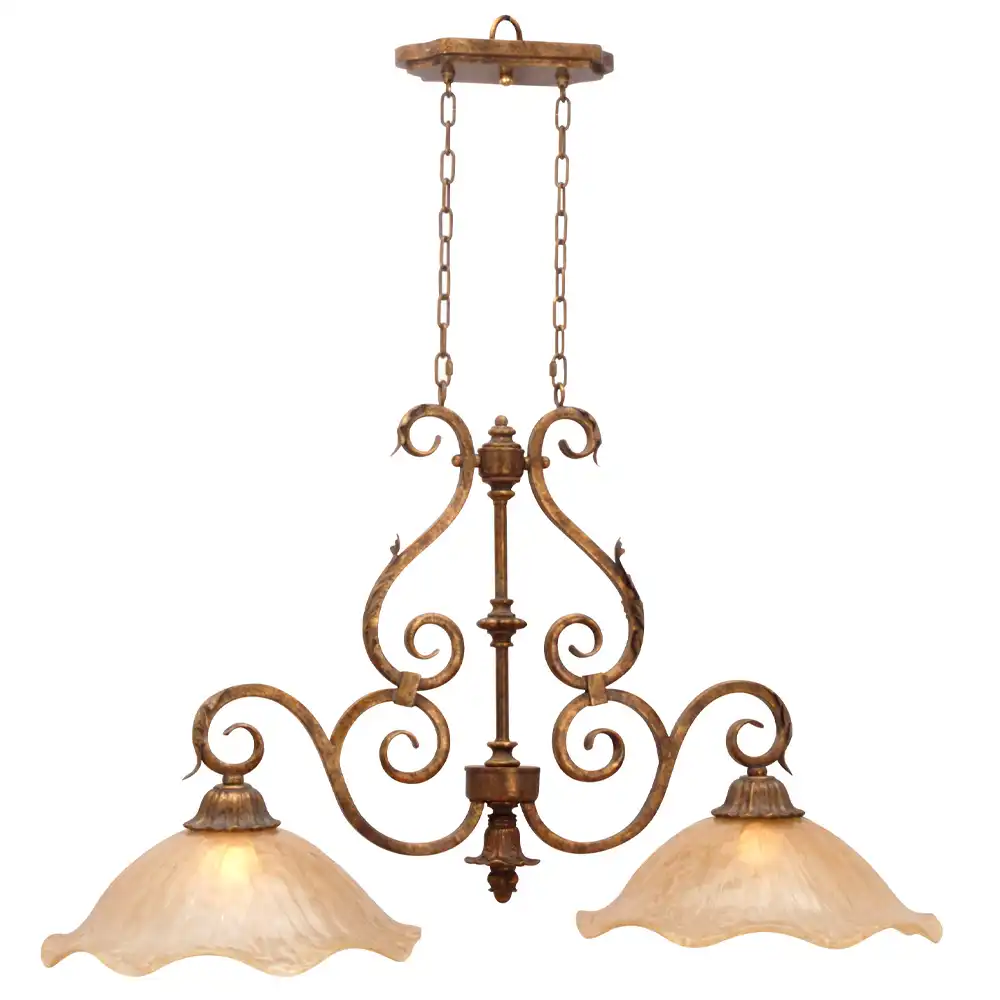 The pendant showcases our distinctive Moroccan Gold finish, a hand-applied, antiqued gold with a warm, coppery-bronze base. This rich, multi-dimensional finish features subtle darker distressing that enhances the intricate scrollwork and organic leaf-like accents, creating a luxurious, time-worn patina. Suspended gracefully below are two exquisite Antique Mist glass lampshades. These uniquely textured, bell-shaped shades possess a delicate, frosted appearance with subtle undulations, reminiscent of soft clouds or ancient glass. They diffuse light beautifully, casting a gentle, inviting glow that is perfect for task lighting over an island or creating ambiance over a dining table.