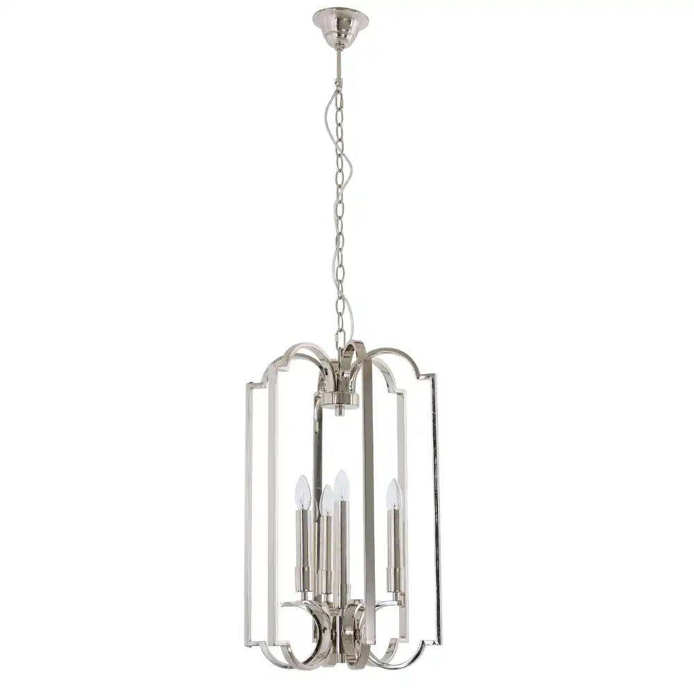 The pendant’s design is a chic interpretation of classic lantern styles, featuring an open, architectural framework. Four elegantly curved and straight metal bars form a captivating, multifaceted cage, creating a sense of both openness and structure. Within this stylish frame, four candelabra-style light holders are centrally positioned, designed to accommodate clear bulbs that cast a brilliant, unimpeded glow. The thoughtful interplay of robust metalwork, crisp lines, and luminous finish reflects a profound understanding of modern aesthetics and an unwavering commitment to superior materials and craftsmanship. Its refined silhouette makes it an ideal choice for entryways, dining areas, or living rooms seeking a touch of contemporary grandeur.