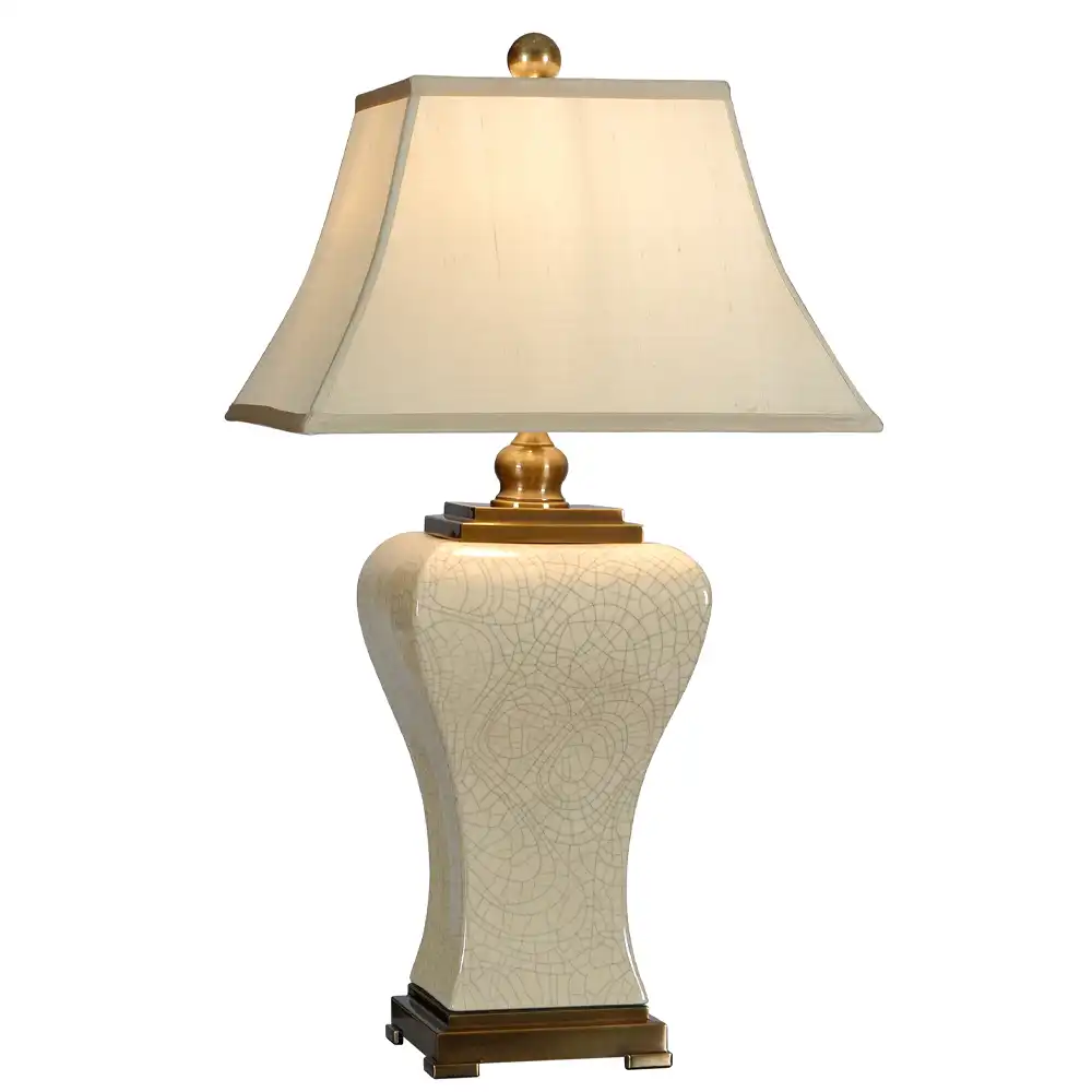 Meticulously constructed, this table lamp features a robust structure that combines high-strength metal with a beautifully shaped ceramic urn body, ensuring exceptional stability and enduring quality for long-term use. The lamp’s distinctive base is sculpted in a graceful, gently flared urn silhouette, reminiscent of revered antique porcelain. This ceramic body is adorned with a delicate yet captivating crackle glaze in a soft, muted cream or ivory tone, which adds a subtle texture and depth, highlighting its artisanal craftsmanship and connection to historical design traditions.