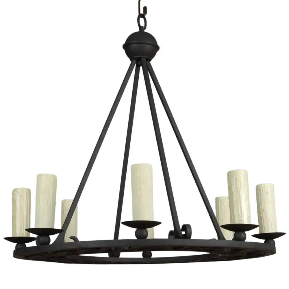 The chandelier’s defining feature is its deeply rich and textural finish: a heavily distressed matte black or dark charcoal with subtle, hand-rubbed bronze undertones. This robust finish is characterized by an almost raw, unpolished appearance, where the dark base is subtly broken by lighter metallic highlights, simulating centuries of natural wear and the rich patina of aged wrought iron. The surface exhibits a slight irregularity, enhancing its authentic, handcrafted appeal. The design is a study in rustic strength, featuring a substantial central ring from which eight candle holders extend. The ring itself showcases a subtly ornate, cutout pattern along its base, adding a touch of intricate detail to its otherwise austere form. Suspended by strong, angular arms from a central spherical element, the fixture exudes a sense of historical gravitas. Each of the eight lights is presented as an elegant “candle” holder, adorned with creamy, textured wax-drip effect LED candles, providing a warm, flickering glow reminiscent of traditional monastic or castle lighting but with modern efficiency and safety.