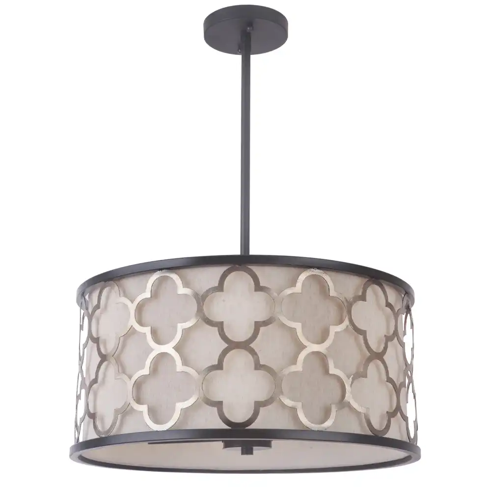 Expertly crafted from high-strength metal, the “Moroccan Trellis” features a classic drum silhouette. Encircling a warm, off-white fabric shade, the detailed metal overlay showcases a beautiful quatrefoil pattern, inspired by Moroccan architecture. This intricate laser-cut or welded design creates a mesmerizing play of light and shadow, casting elegant patterns across your space. Five lights are thoughtfully positioned within the drum, providing ample, diffused illumination that creates an inviting and ambient atmosphere. Designed for enduring stability and long-term aesthetic appeal, this handcrafted pendant is a testament to superior craftsmanship and thoughtful design.