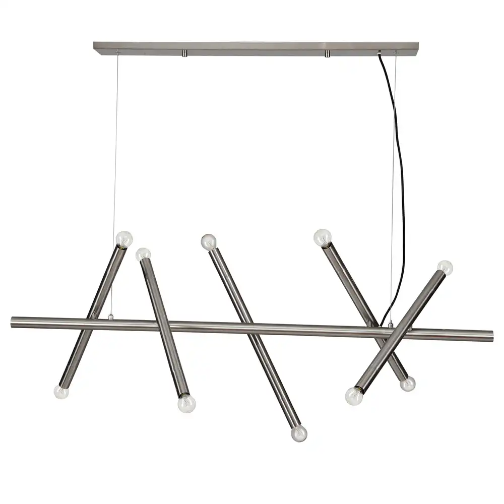 The “Nexus” pendant features an dynamic and engaging linear sculptural design, formed by a central horizontal rod intersected by a series of angled, secondary rods. Ten exposed light sources (bulbs not included, small globe or G9 LED bulbs recommended) are strategically integrated at the ends of these rods, creating a vibrant, multi-directional spread of light that is both functional and visually stimulating. This open, artistic arrangement not only provides comprehensive, widespread illumination but also facilitates effortless bulb replacement and simplified cleaning, contributing to a superior end-user experience. Its elongated, abstract form is perfectly suited for making a bold design statement over long dining tables, kitchen islands, or contemporary workspaces, offering both abundant light and unparalleled modern artistry.