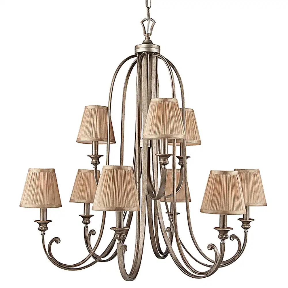 The chandelier’s defining feature is its deeply sophisticated and nuanced finish: a hand-painted distressed silver-gilt or antique champagne silver. This luminous surface treatment is characterized by its soft, shimmering silver base, artfully layered with subtle golden or champagne undertones, then deliberately distressed to reveal darker, aged details in the crevices. This creates a rich, complex patina that radiates a delicate, old-world charm, allowing it to harmoniously blend with both classical and transitional decor schemes. The design features a gracefully sculpted central column, from which two tiers of elegantly curved arms extend. The upper tier presents three lights, while the more expansive lower tier accommodates six lights, culminating in individual light holders. Each light is beautifully complemented by a pleated, tapered fabric shade in a warm, muted beige or cream hue. These meticulously crafted shades diffuse a soft, inviting light, ensuring a comfortable and intimate atmosphere perfect for gatherings or quiet contemplation.