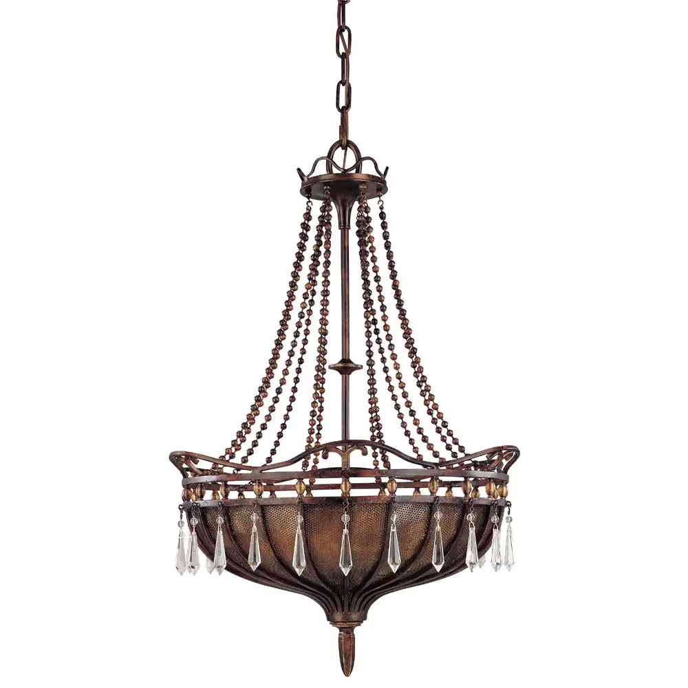 The fixture features a rich and complex hand-applied Tuscan Bronze finish. This distinctive finish boasts a deep, earthy brown base with subtle, lighter coppery or golden bronze highlights expertly brushed onto raised areas and edges, creating a beautifully aged and antique appearance. This multi-tonal effect provides exceptional depth and character, ensuring the metalwork itself is a work of art. The outer frame is adorned with graceful sweeps of amber-hued beaded strands, gracefully draping from the central column to the elegant rim, adding a layer of sophisticated sparkle. Beneath this, a finely woven bronze-toned mesh diffuser provides a unique textural element, subtly veiling the light source and creating a warm, inviting glow that permeates the entire fixture. Completing this opulent design are the multiple faceted clear crystal teardrops delicately suspended from the lower rim, catching and refracting light to create a dazzling display.