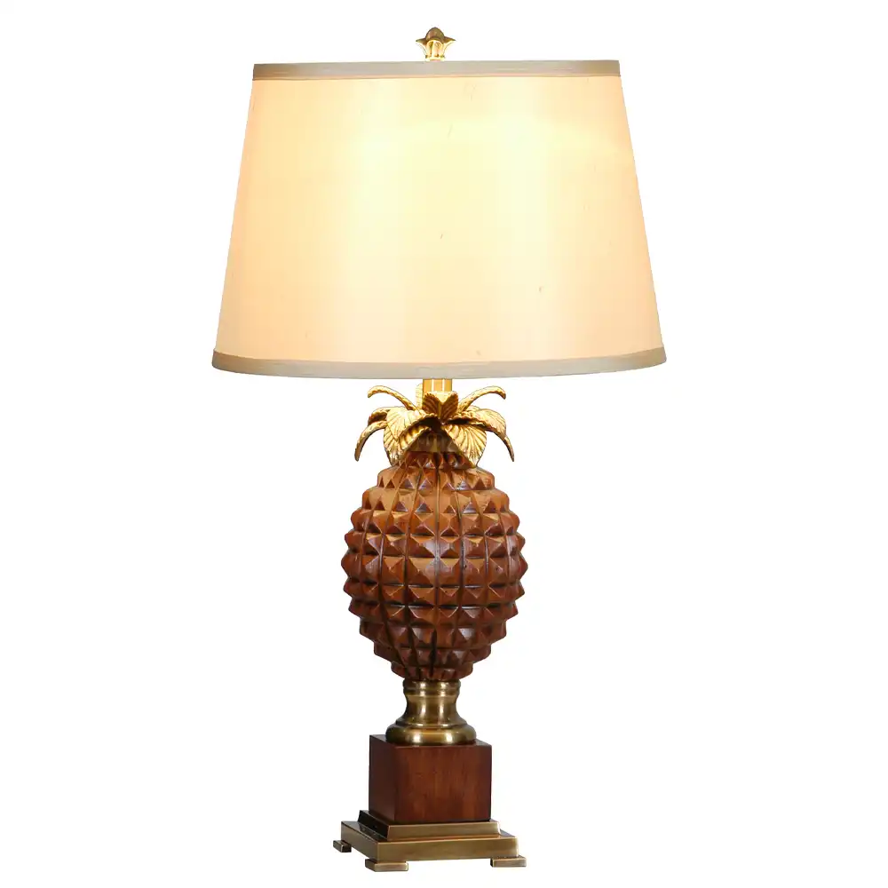 This exquisitely handcrafted table lamp features a robust construction that combines high-strength metal with a solid wood base, ensuring exceptional stability and enduring beauty. The lamp’s focal point is its richly textured pineapple body, a timeless symbol of hospitality and luxury, meticulously carved or cast with intricate facets that catch and reflect light beautifully. This central pineapple is crowned with delicate metal fronds, all finished in a warm, antique bronze that complements the natural grain and deep hue of the rectangular wood base. The interplay between the lustrous metal and the organic texture of the wood creates a visual harmony that speaks volumes about high-quality materials and expert artistry.