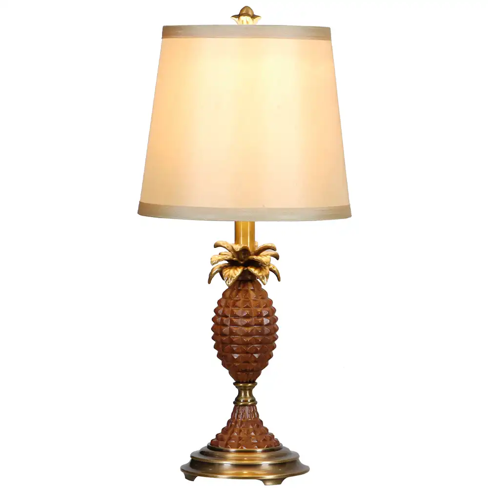 Handcrafted metal table lamp featuring an exquisite antique bronze pineapple base and a classic fabric empire shade. A symbol of hospitality and elegance, designed for sophisticated interiors.