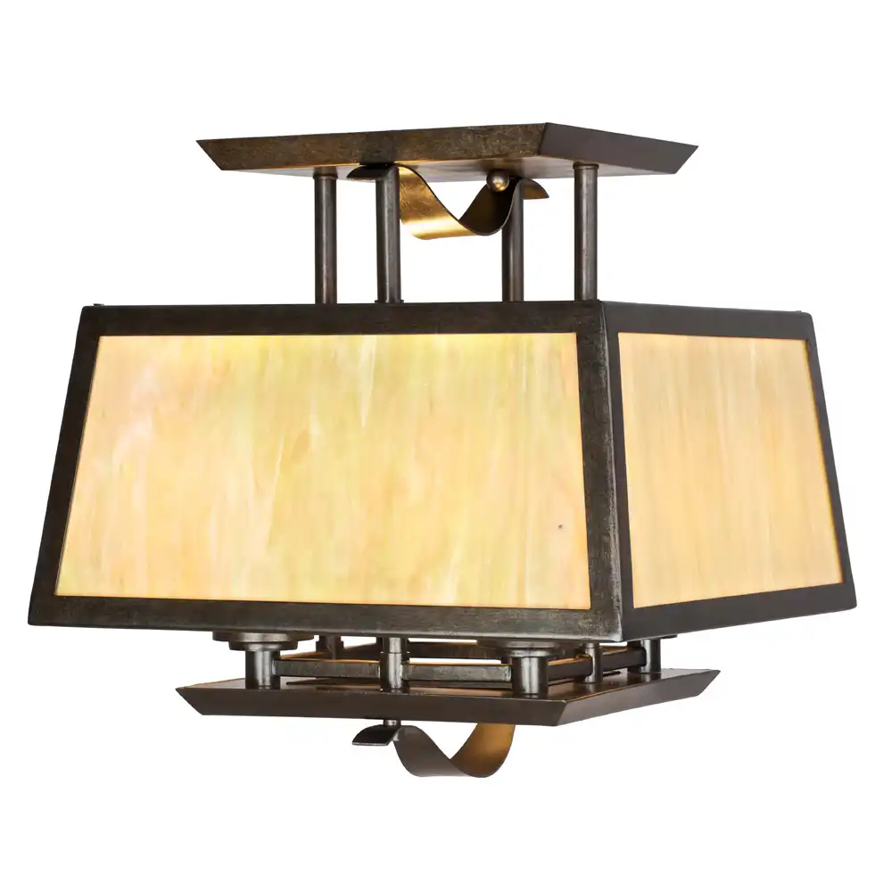 The pendant’s defining feature is its deeply textured and layered finish: a distressed dark bronze or iron, expertly hand-rubbed with subtle golden or coppery highlights. The sturdy metal frame boasts a rich, almost blackened bronze hue, over which lighter metallic tones have been subtly applied, particularly on the edges and raised surfaces. This hand-rubbing technique creates a nuanced depth and highlights the fixture’s strong, clean lines, while darker antiquing settles into the recesses, enhancing its historical and artisanal appeal. The robust square-shaped outer frame features solid panels crafted from marbled art glass in warm amber and creamy tones. These unique glass panels diffuse light with a soft, ethereal glow, creating an intimate and comfortable atmosphere reminiscent of classic Arts and Crafts design. Decorative, subtle scroll accents extend from the top and bottom plates, adding a touch of refined detail.