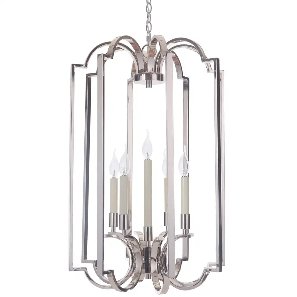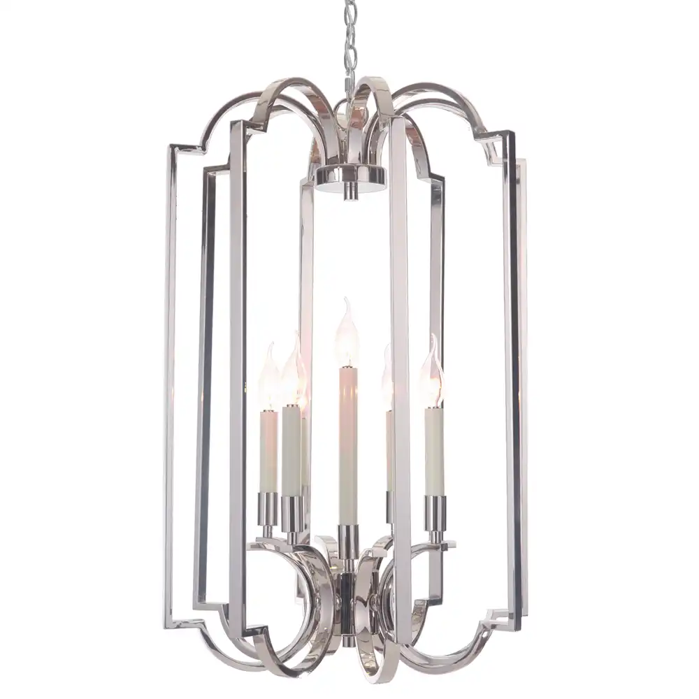 Command attention and infuse a sense of timeless grandeur into your next project with the “Regal Arch” 5-Light Geometric Lantern Pendant. This magnificent handcrafted fixture is meticulously fashioned from high-strength metal, showcasing an exquisite Polished Nickel finish. Characterized by its brilliant, mirror-like sheen with a subtle warm undertone, this finish offers a luxurious, sophisticated aesthetic that beautifully complements both traditional and contemporary interiors. The robust construction and stable framework guarantee enduring beauty and functionality, ideal for prestigious commercial spaces and high-end residential designs.