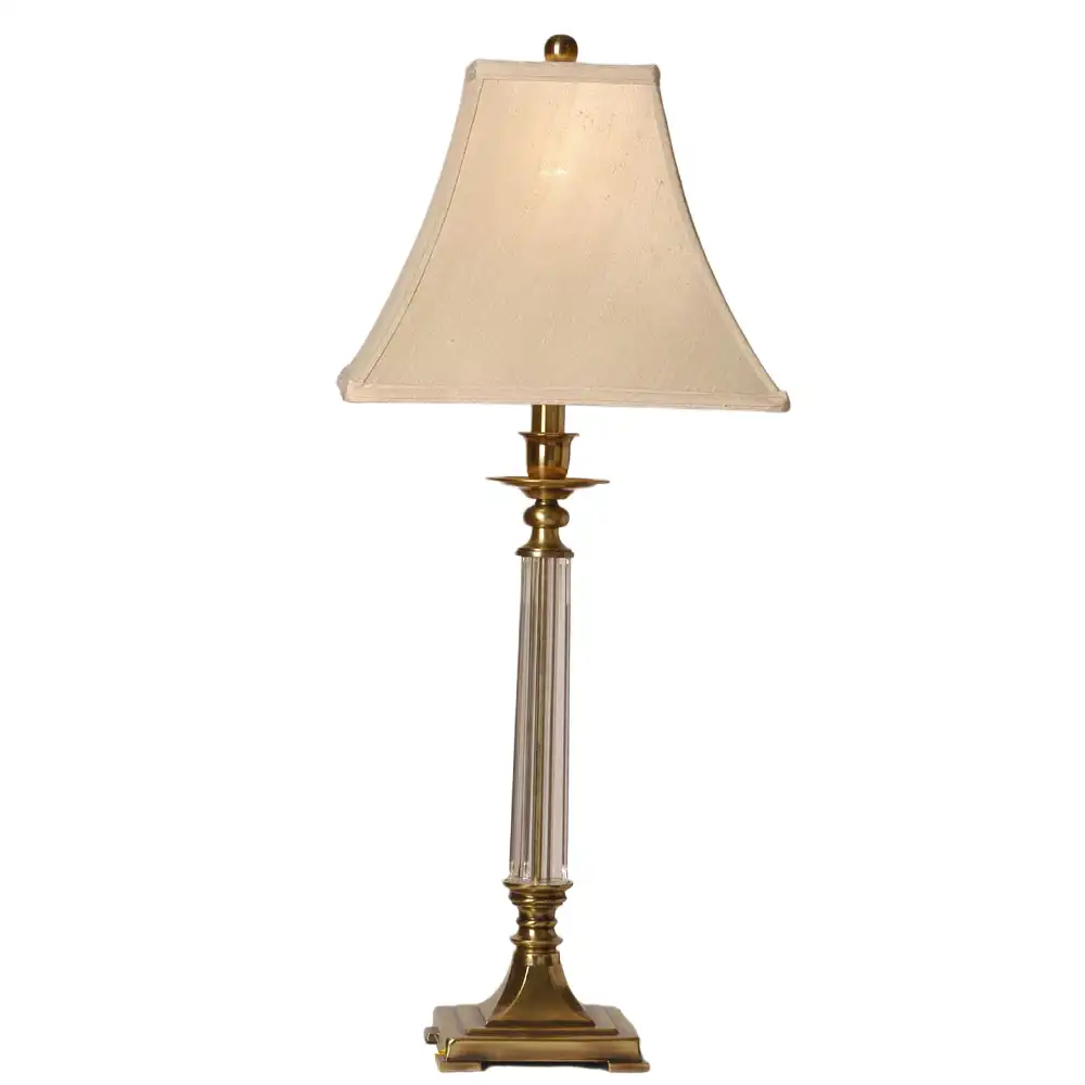 The lamp’s striking body features a statuesque, fluted or faceted column crafted from clear, high-quality crystal or glass. This transparent elegance allows light to beautifully refract and sparkle, creating a radiant visual effect. This pristine crystal element is perfectly complemented by gleaming polished brass or gold-finished metal components, from the intricate detailing around the column’s top to the robust, multi-tiered square base. The use of high-strength metal throughout ensures a stable structure and exceptional durability, promising long-term beauty and functionality.