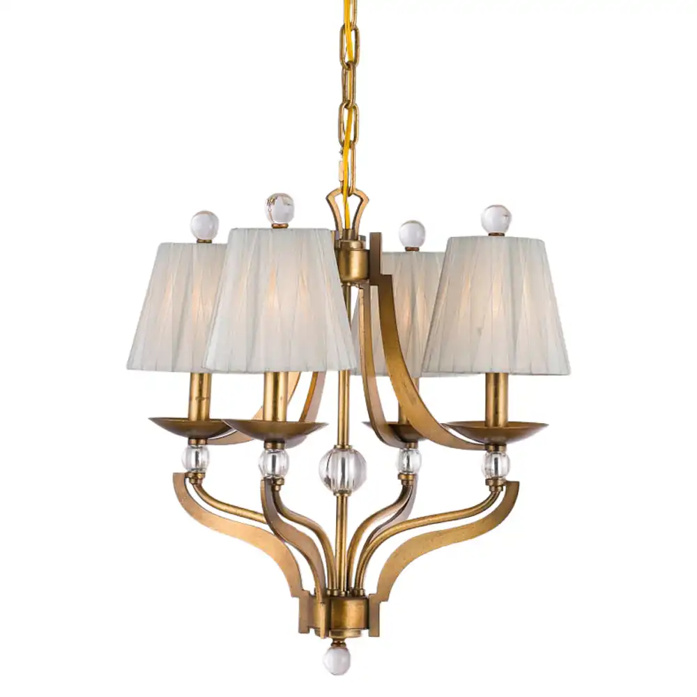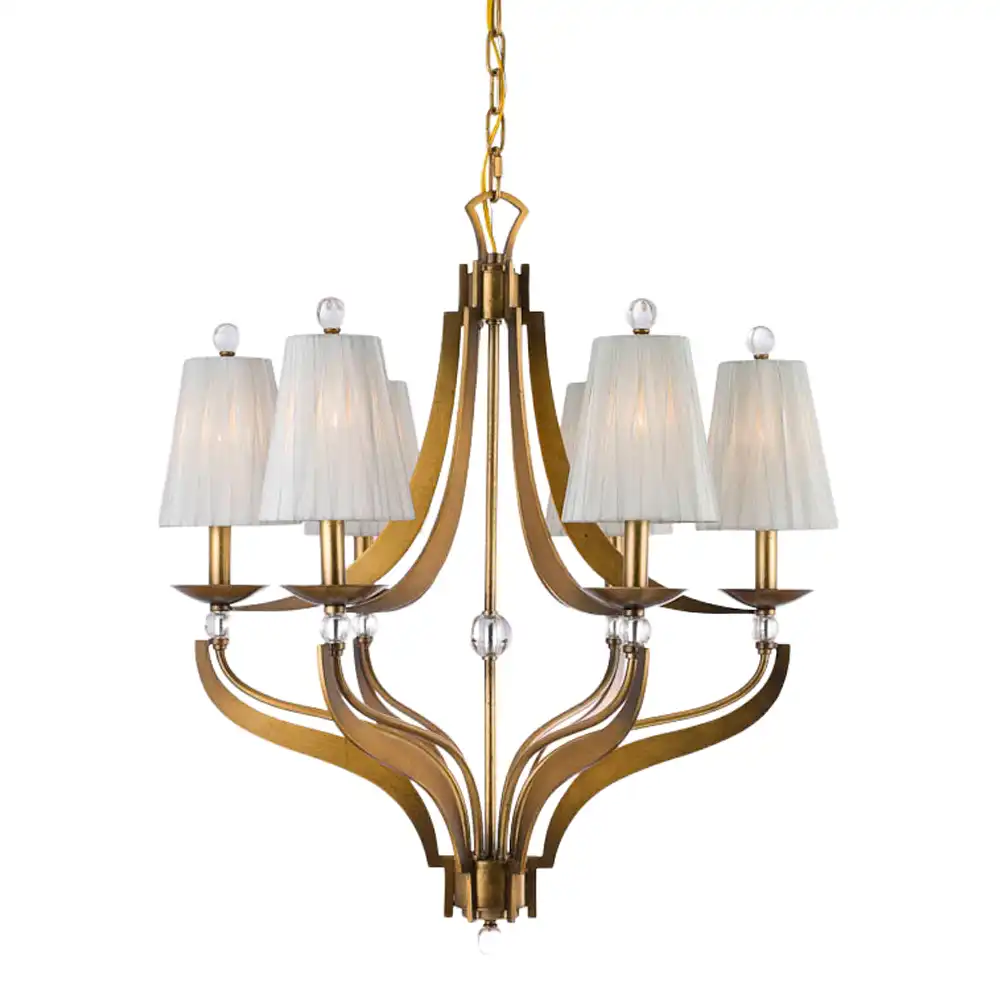 Each of the six lights is gracefully shaded by an elegant, pleated off-white fabric shade, diffusing a soft, ambient glow that creates an inviting and serene atmosphere. Complementing the gilded frame are tasteful clear glass orb accents and finials, adding a touch of refined sparkle and visual interest without overwhelming the design. These details underscore the profound understanding of interior decoration inherent in every piece we create.