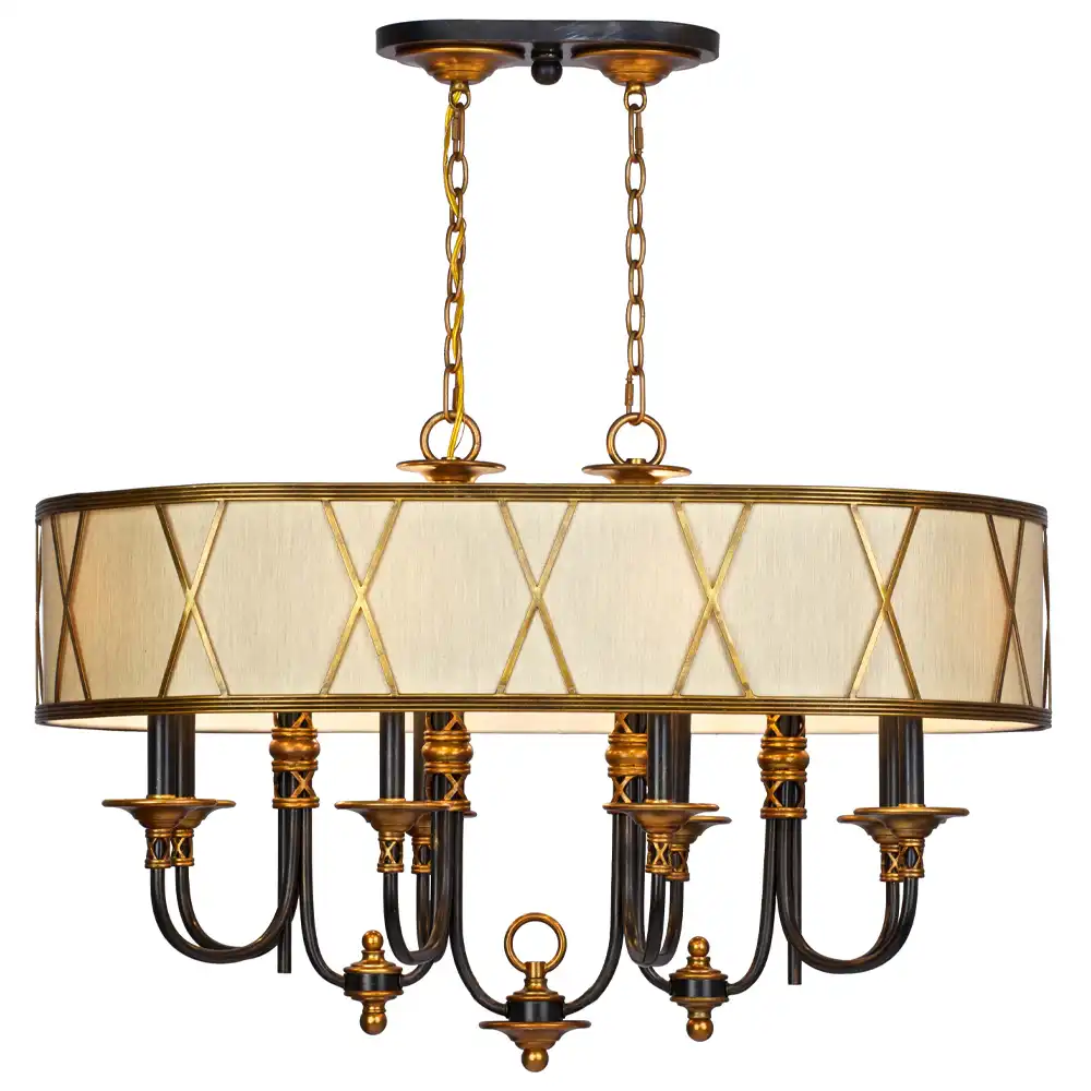 The chandelier’s elongated frame is skillfully constructed from high-strength metal, boasting a captivating dual-tone finish that commands attention. The prominent linear drum frame and select decorative accents are finished in a rich antiqued brass, exhibiting a warm, burnished luster that evokes classical sophistication. This is powerfully contrasted by the graceful, downward-curving arms and the ceiling canopy, which feature a deep, satin black finish. This elegant interplay of finishes provides a striking visual dynamic and structural definition, suitable for both traditional and modern decors. The stable, high-strength metal construction guarantees both enduring aesthetic appeal and reliable long-term performance, a testament to our factory’s dedication to superior durability.