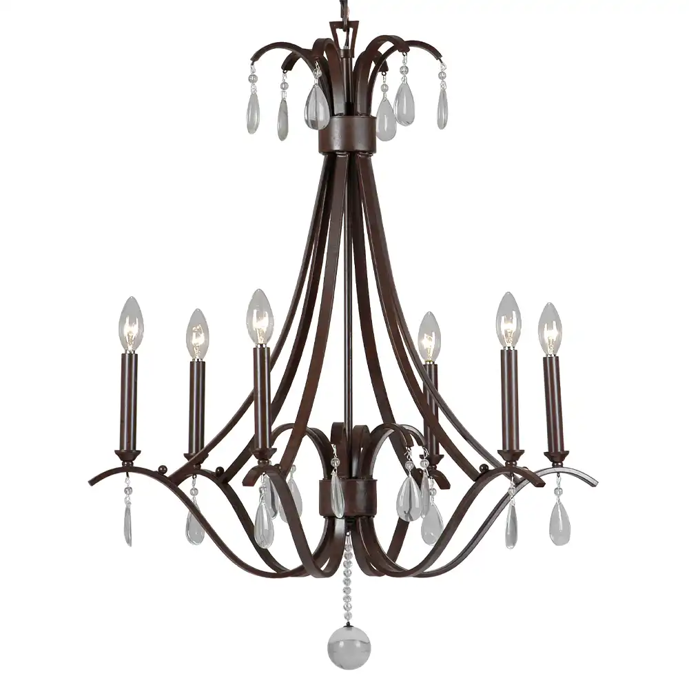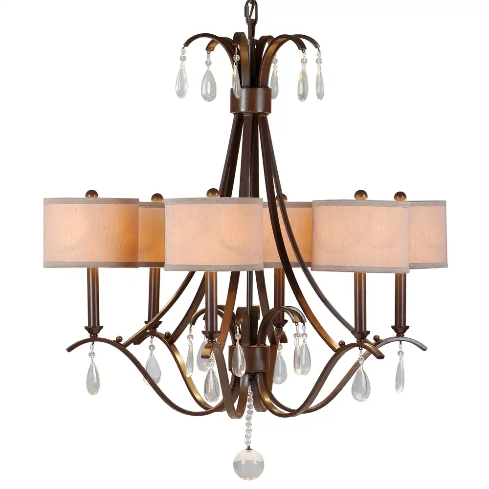 An elegant 6-light chandelier with a matte dark bronze finish, natural linen shades, and clear crystal accents. Handcrafted for rustic-luxe interiors; fully customizable for OEM/ODM/B2B.