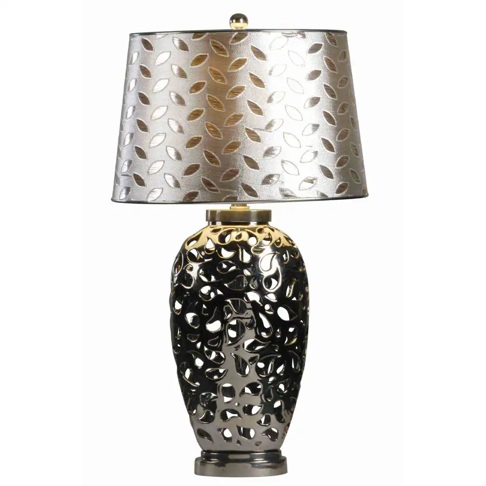 The lamp’s stable structure is supported by a high-strength metal base, ensuring enduring durability and long-term compatibility for continuous use in diverse settings. The main body of the lamp is a masterpiece of design, crafted from high-quality porcelain and featuring an exquisite pierced or cut-out pattern. This artisanal technique creates a beautiful interplay of light and shadow, allowing the inner glow to subtly emanate through the intricate design, casting unique patterns in the surrounding space. The metallic sheen of the porcelain body further enhances its modern appeal, reflecting light and adding a touch of sophisticated glamour.