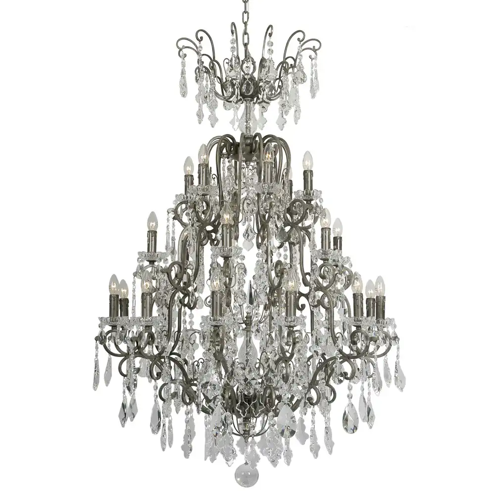 Commanding attention with its magnificent scale and exquisite detailing, the “Silvered Regency” Chandelier is a statement piece designed to imbuse grand interiors with unparalleled brilliance. This exceptional 3-tier, 24-light pendant fixture showcases superior craftsmanship and a captivating aesthetic, perfect for prestigious residential, hospitality, or commercial projects.