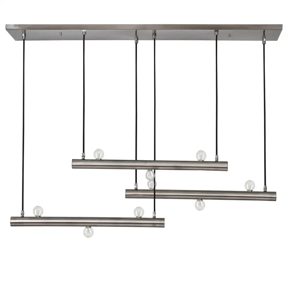 The Staggered Tube Silhouette: The defining feature of this fixture is its three horizontal brushed nickel tubes suspended at varying heights. This staggered arrangement mimics geological strata or urban architectural layers, providing a dynamic visual interest that shifts depending on the viewing angle.