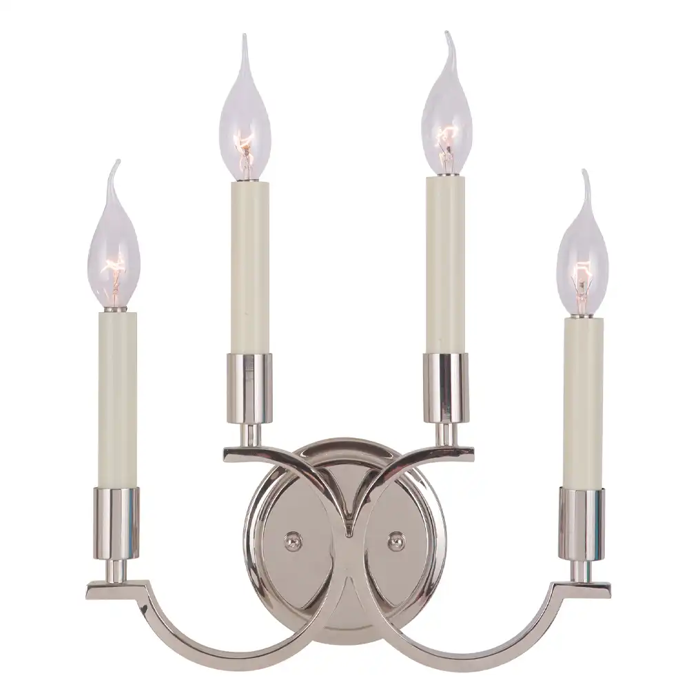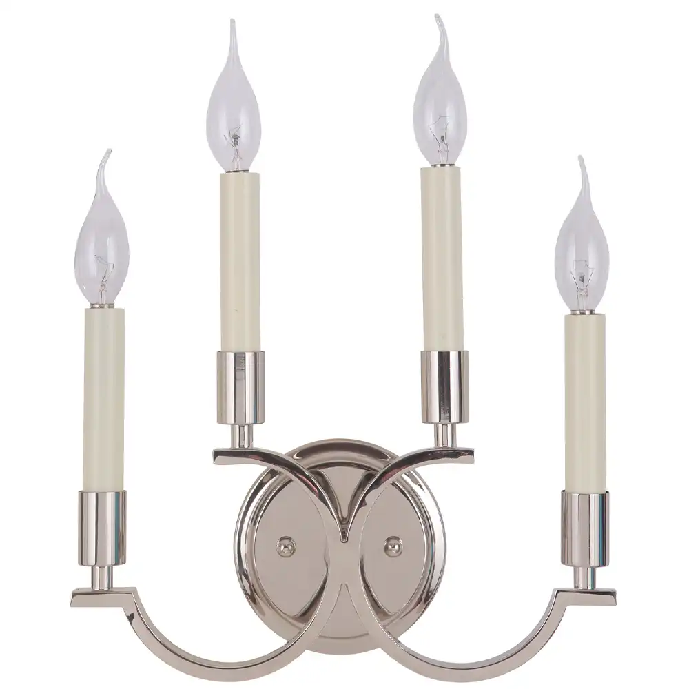 Constructed entirely from high-strength metal, its stable structure ensures exceptional durability and reliable performance, compatible with long-term use in both residential and high-end commercial applications. The elegant, symmetrical curved arms emanating from a stylish central backplate create a captivating silhouette. Each arm supports a candle-style bulb within a pristine sleeve, reflecting meticulous craftsmanship and a profound understanding of decorative artistry. The four lights provide a generous, inviting glow, perfect for creating ambient lighting that enhances the overall sophistication and warmth of a room.