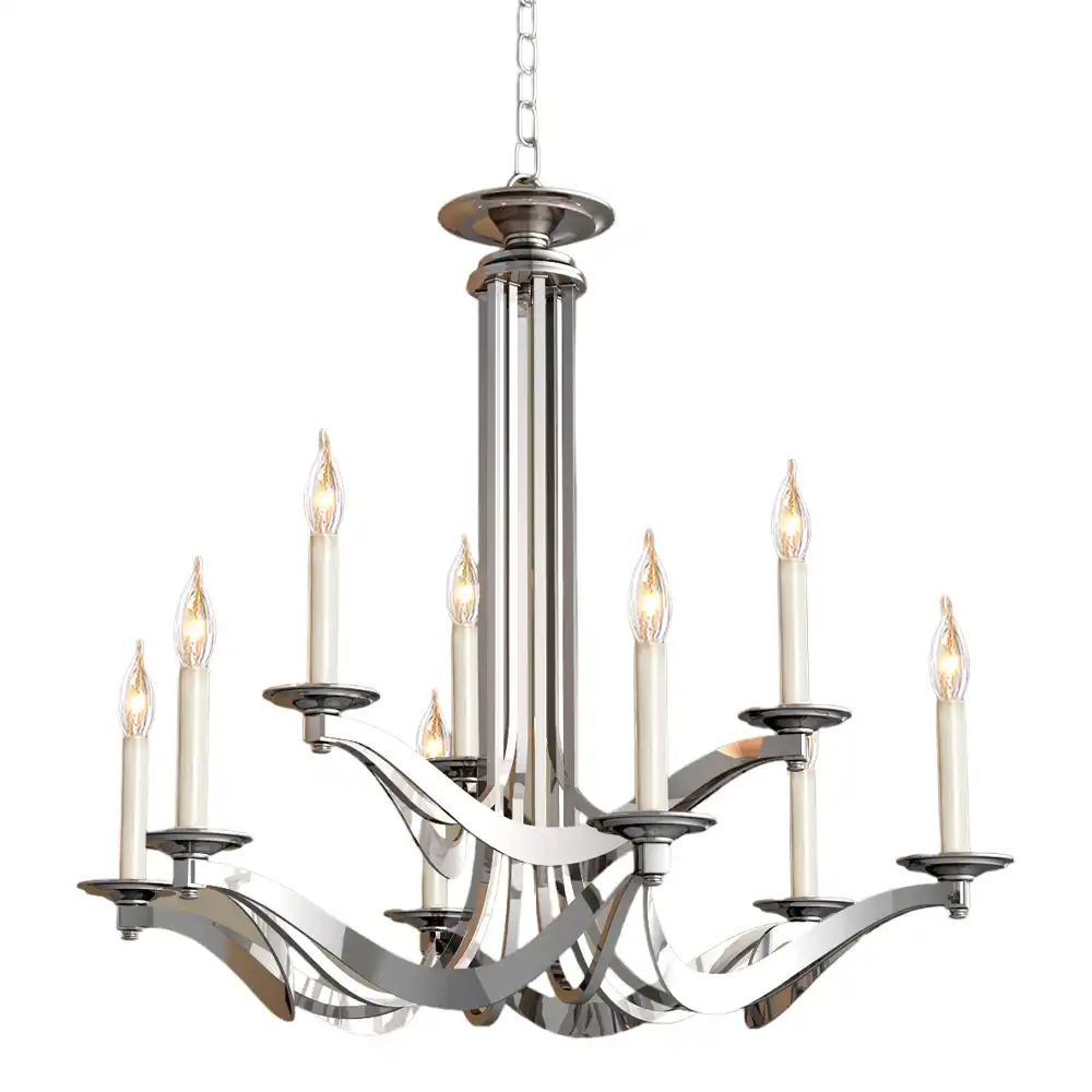 Magnificent 2-tier, 9-light chandelier with a brilliant polished nickel finish, dynamically curved arms, and classic candle-style illumination. Customizable for B2B and OEM/ODM projects.