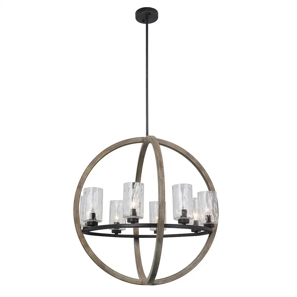 The “Terra” pendant features a striking open-orb design, created by intersecting metal bands that encase a substantial eight-light candelabra cluster (bulbs not included). Each light is further adorned with a unique clear seeded glass cylinder, which diffuses the light beautifully, adding a subtle sparkle and enhanced visual interest. This airy, sculptural form not only maximizes light dispersion, casting an inviting glow throughout large spaces, but also serves as a captivating focal point without overwhelming the room. The open design and accessible glass shades facilitate effortless bulb replacement and simplified cleaning, contributing to a superior end-user experience. Ideal for making a grand statement over large dining tables, in double-height entryways, or in spacious living areas, this fixture seamlessly blends rustic charm with modern elegance, all within its resilient metal construction.