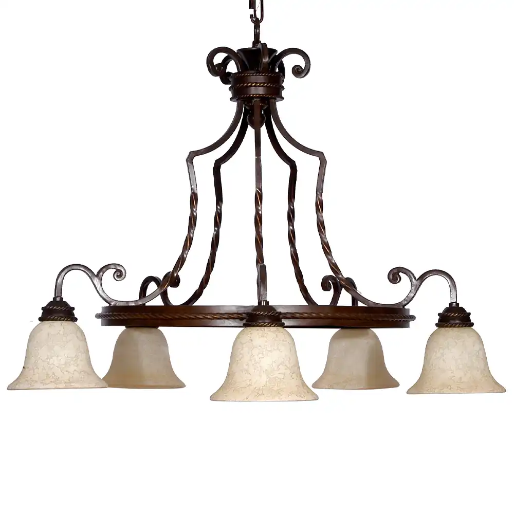 The fixture showcases a magnificent hand-applied distressed Bronze finish with subtle Copper and Gold Highlights. This intricate finish features a deep, earthy brown base, expertly textured and brushed with lighter, burnished copper and faint gold accents, particularly on the raised twisted iron details and along the edges of the metalwork. This deliberate distressing and multi-tonal application create an authentic, aged patina, giving the metal a rich, storied character that evokes the warmth of a Tuscan farmhouse or a country lodge. The central column descends to a sturdy metal circular band, upon which the five light holders are expertly spaced at equal intervals. Each light is crowned with a beautifully shaped bell-shaped alabaster-hued glass shade, featuring delicate, organic mottling. These shades diffuse the light to create a soft, warm, and inviting ambiance, beautifully complementing the antique finish of the metal.