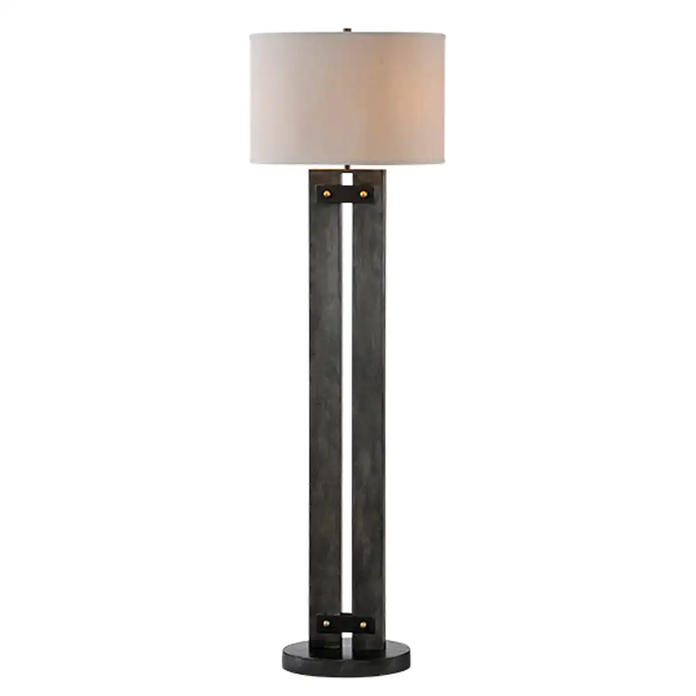 The lamp’s striking base is meticulously handcrafted from high-strength metal, ensuring a supremely stable structure and enduring durability for long-term use. Its defining characteristic is the innovative open rectangular frame design, composed of two sturdy, parallel metal columns joined by accentuating horizontal metal bands at the top and bottom. These connecting bands feature visible decorative rivets or bolts in a contrasting metallic finish (e.g., brass or copper tones), adding an authentic industrial touch and enhancing the lamp’s architectural appeal. The entire metal structure is enveloped in a sophisticated dark bronze or matte black finish (or specify your actual finish, e.g., antique bronze), lending a rich, grounding presence that complements various décor styles. The frame rests upon a solid, circular metal plinth, ensuring unwavering stability and a clean, minimalist foundation.