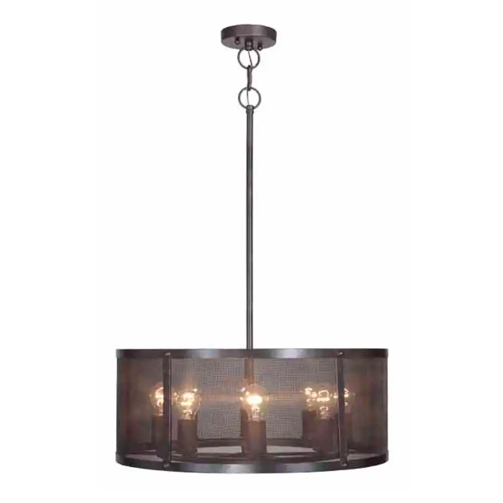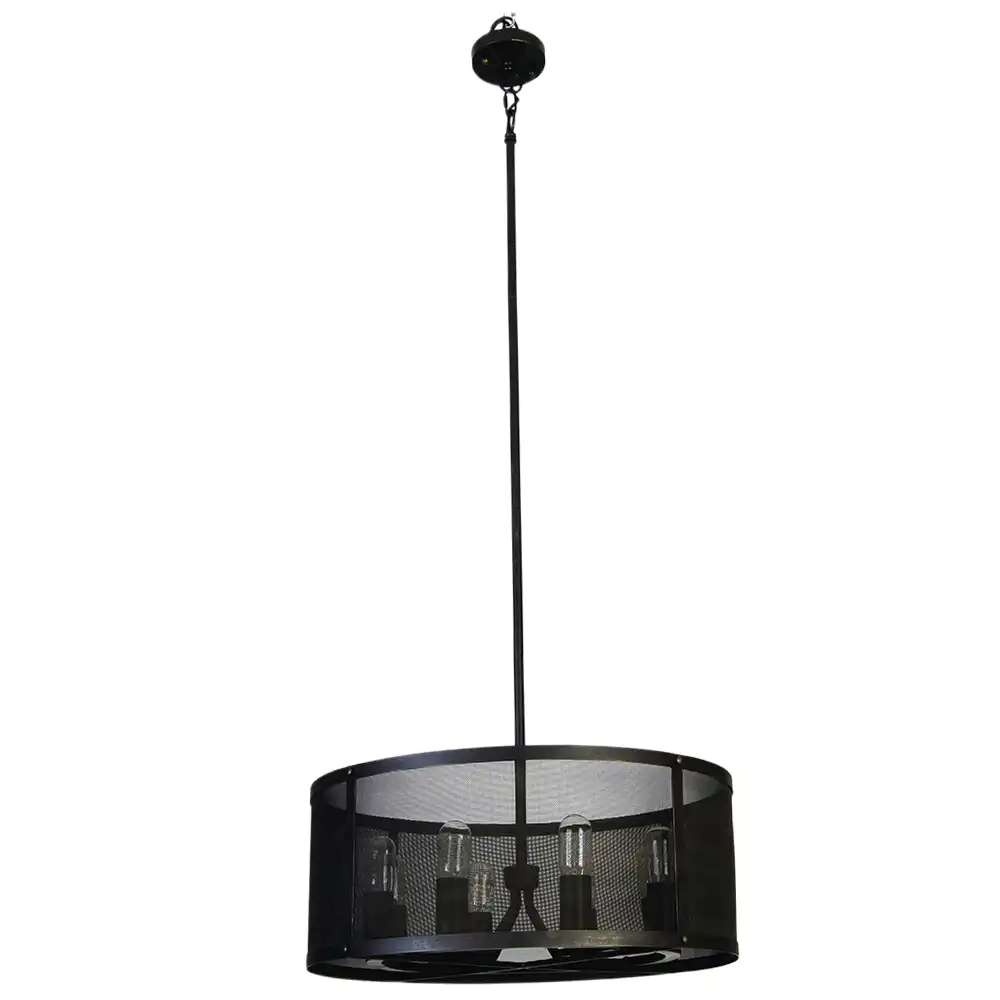The main body of the pendant features a sleek drum silhouette, enveloped by a fine metal mesh screen. This unique mesh design softens the direct glare of the bulbs while allowing ample light to diffuse into the room, creating an inviting and well-lit atmosphere. Within this innovative enclosure, eight exposed light sources are thoughtfully arranged, designed to showcase vintage-style Edison bulbs (not included, but recommended for optimal aesthetic), adding to the fixture’s industrial charm.