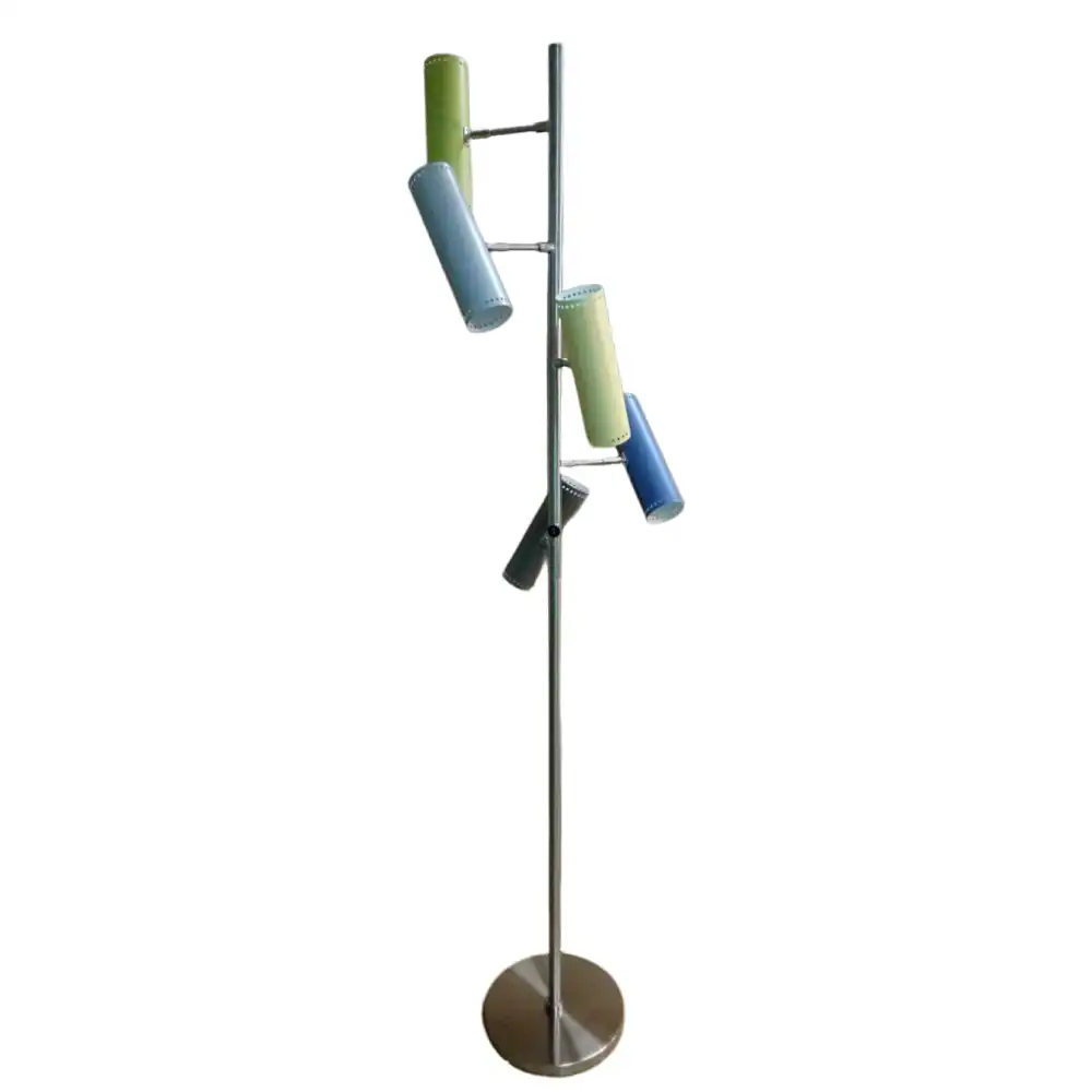 Crafted from high-strength metal, this floor lamp boasts a remarkably stable and durable structure, ensuring a lifetime of reliable performance. The sleek polished chrome finish of the central pole and base provides a contemporary sheen, seamlessly integrating with various decor styles from minimalist to industrial chic. Each of the five individual light shades, meticulously shaped and finished, features a captivating matte powder-coated finish in a vibrant palette of sage green, sky blue, and charcoal grey. These adjustable shades offer directional lighting, allowing you to spotlight architectural features, artwork, or create an inviting ambient glow.
