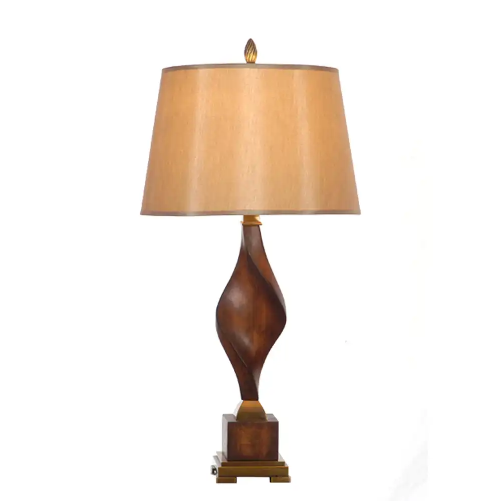 The lamp’s striking central “stem” is meticulously handcrafted from premium solid wood, carved into an elegant, continuous spiral that captivates the eye from every angle. This rich, deep-toned wood provides a warm, natural contrast to the lamp’s sturdy foundation. The base and key structural components are fashioned from high-strength metal, ensuring unparalleled stability and long-term durability, a hallmark of our factory’s commitment to quality. The metal elements feature a subtle brushed gold or antique brass finish, adding a touch of classic luxury and complementing the wood’s inherent warmth.