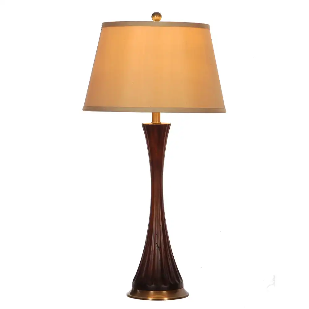 The lamp’s distinctive profile features a beautifully sculpted solid wood stem, showcasing a graceful spindle silhouette with delicate vertical fluting at its base. The wood is meticulously turned and finished in a rich, deep walnut or mahogany hue, bringing a sense of warmth and natural artistry to the design. This elegant wooden body rests upon a substantial high-strength metal base, subtly integrated and finished in a luxurious antique brass or deep bronze, providing both stability and a sophisticated material contrast.