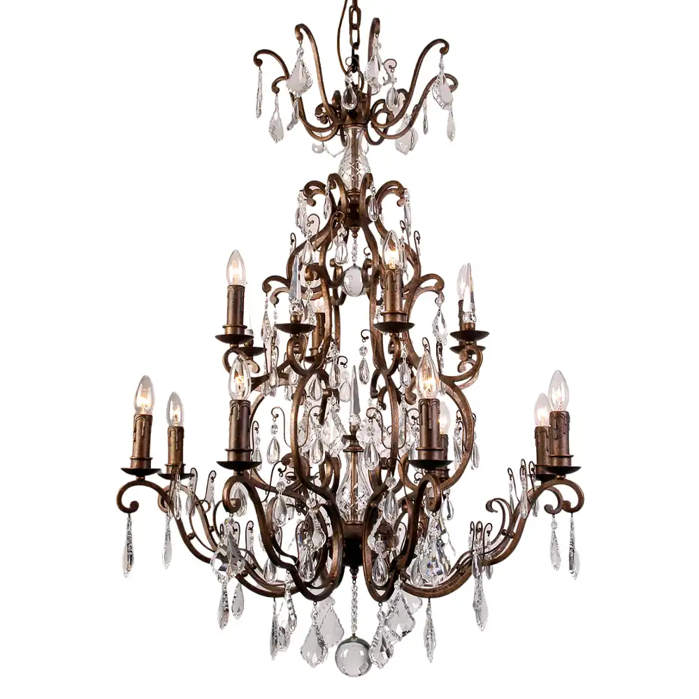 The chandelier’s impressive two-tier structure features a total of twelve gracefully appointed light holders: four on the upper tier and eight on the lower, ensuring expansive and radiant illumination. Its elaborate metalwork is resplendent in a sophisticated hand-applied, distressed antique bronze finish. This rich, multi-layered treatment combines deep brown hues with warm coppery-gold undertones, artfully enhanced by darker antiquing that accentuates every intricate scroll, robust arm, and decorative detail. This finish bestows an authentic, centuries-old luster, evoking the grandeur of historic European châteaux. Adorning the entire structure are cascades of precision-cut clear crystals, featuring both faceted drops and elegant pendants. These dazzling elements are meticulously arranged to catch and refract light from every angle, creating a breathtaking symphony of sparkle and brilliance.