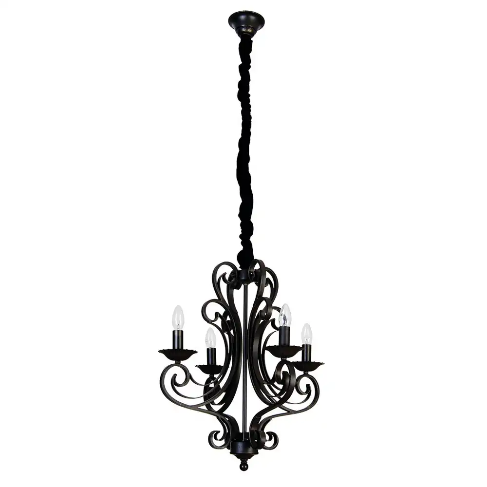 The chandelier’s captivating silhouette is defined by an intricate arrangement of hand-forged scrollwork, reminiscent of classic Victorian design elements. This elegant framework is adorned with a sophisticated antique black iron finish. This deep, matte black hue, with subtle lighter grey or very dark bronze highlights, perfectly emulates naturally aged, forged iron, providing a robust, understated, and historically authentic appearance. Four gracefully curved arms extend to support candelabra-style lights, designed to cast a warm, inviting glow that is perfect for creating ambiance and focused illumination. The pendant is suspended by a chain, elegantly concealed within a black fabric-wrapped sleeve, further enhancing its refined, traditional aesthetic.