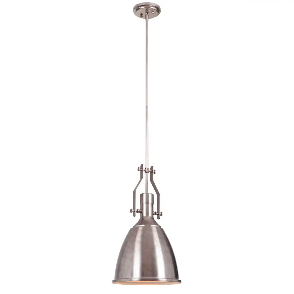 The pendant’s sturdy, handcrafted structure is entirely made from high-strength metal, featuring a unique Distressed Pewter finish. This finish is characterized by its cool, muted gray tone with deliberate, subtle variations in shading, ranging from lighter silvery-gray highlights to darker, almost charcoal areas, creating an authentically aged and weathered appearance. It has a low-luster, almost matte sheen that evokes the look of well-worn, antique metal, adding significant character without being overly ornate. The classic dome shade design directs light downwards, providing efficient and concentrated illumination.