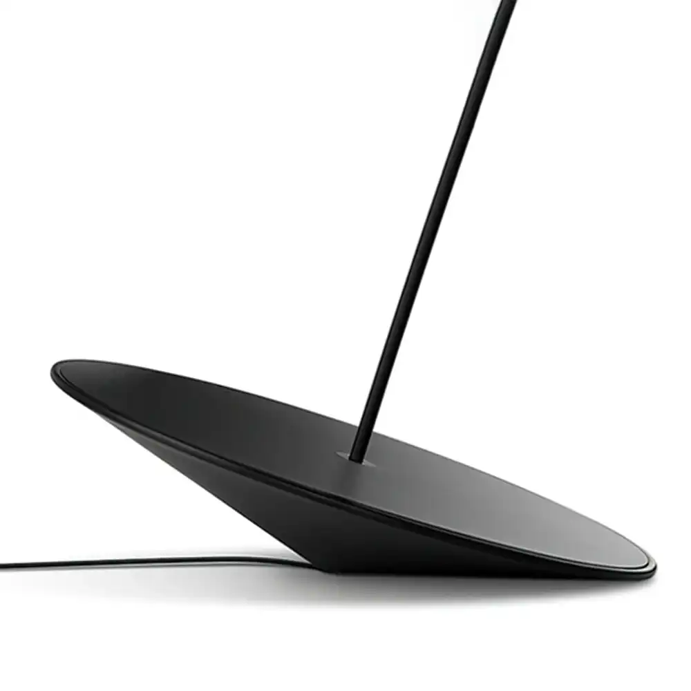 The lamp’s defining characteristic is its dramatic, gracefully curved arm, which cantilevers elegantly to suspend a minimalist, conical shade. Finished in a sophisticated matte black, the lamp exudes understated luxury and allows its unique form to take center stage. The intelligent design of the weighted, tilting disc base not only ensures exceptional stability but also contributes to its artistic “tumbler” aesthetic, creating a captivating visual balance. This profound understanding of form, balance, and material application reflects exquisite craftsmanship and a keen eye for modern interior decoration.