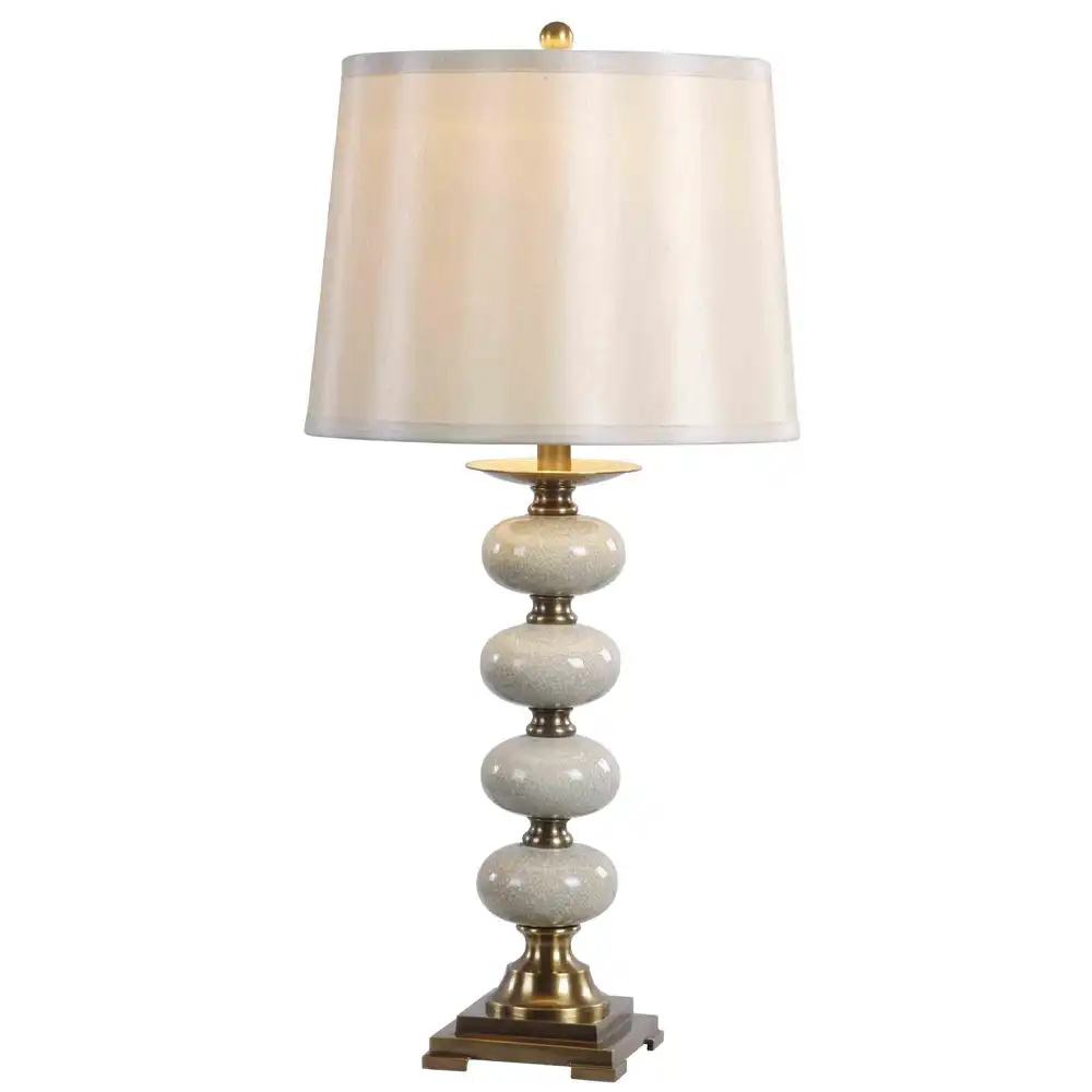 Crowning this elegant stacked base is a classic empire lampshade, crafted from premium quality fabric in a soft, neutral cream hue. This choice of shade provides a warm, diffused glow, perfect for creating an inviting and serene ambiance in living rooms, bedrooms, or sophisticated entryways. The harmonious blend of textures—the smooth fabric, the crackled ceramic, and the gleaming brass—reflects a profound understanding of mixed-material design and a dedication to exquisite detailing.