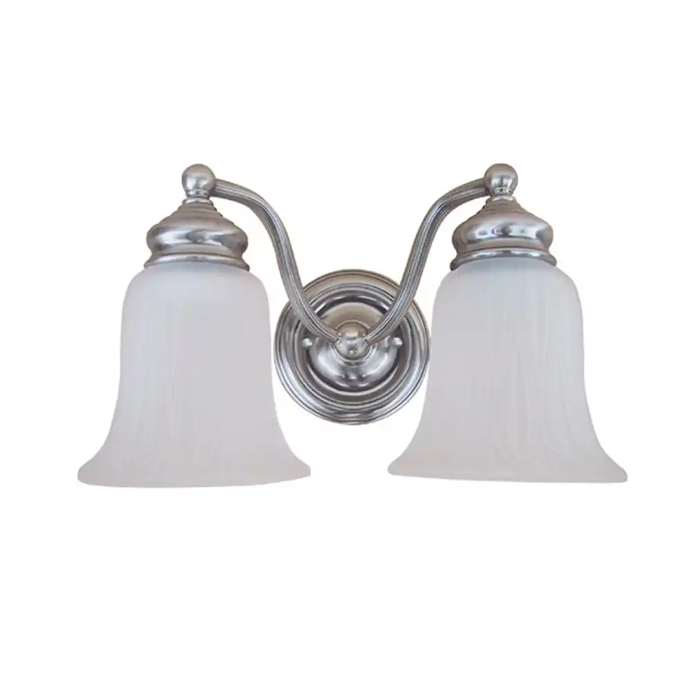 This two-light wall fixture is constructed from robust, high-strength metal, ensuring a stable and sturdy structure that is built to withstand the test of time. The lustrous polished chrome finish offers a brilliant, mirror-like sheen that exudes sophistication and beautifully complements a wide array of design styles, from traditional to modern minimalist. Its elegantly curved scroll arms and classic ribbed frosted bell-shaped glass shades work in harmony to diffuse light softly and evenly, casting an inviting, ambient glow perfect for vanity areas, powder rooms, or as an accent in hallways and other living spaces.